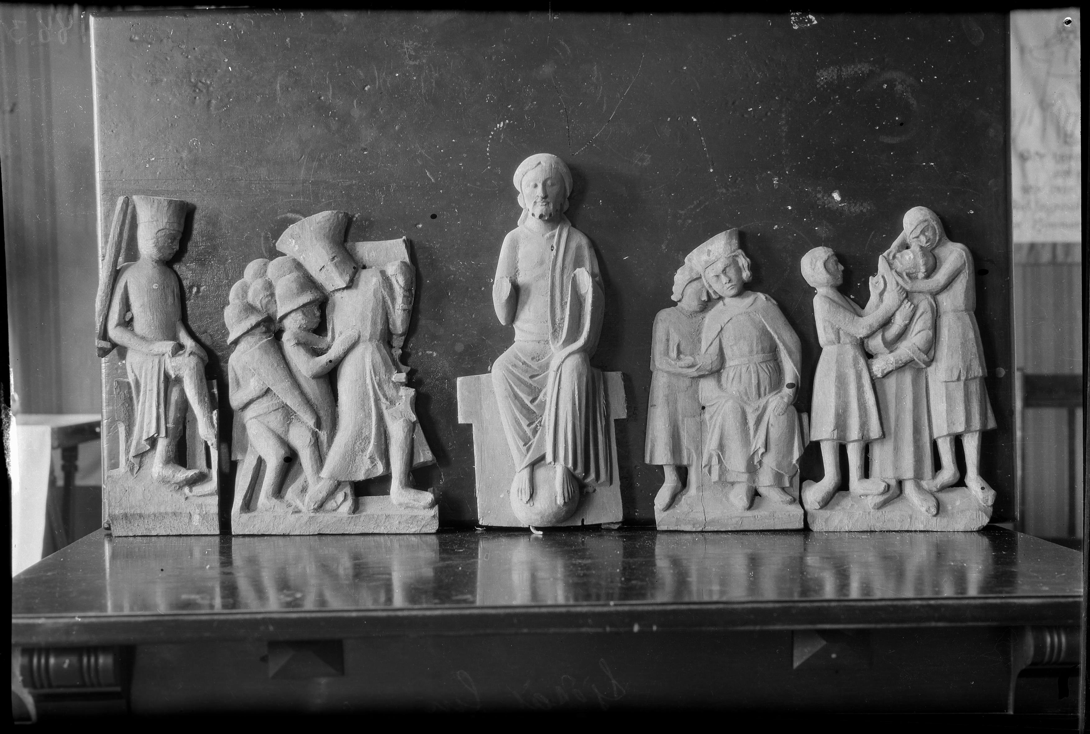 • Träskulpturer: sårad riddare, Olofs fall i slaget vid Sticklastad, Majestas Domini, Olof bränner spånorna och Einar och Andreas skär tungan av Richard.