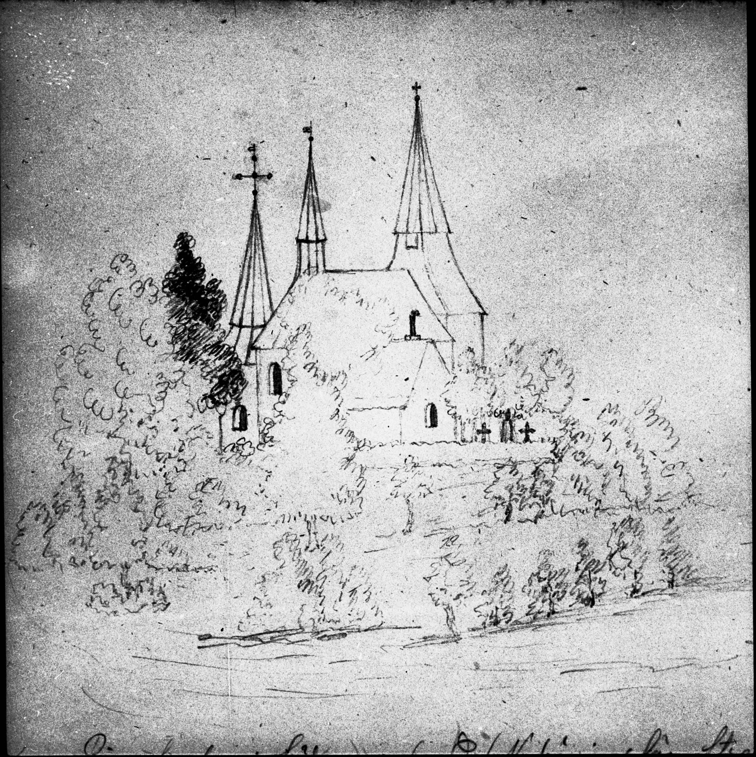• Foto av teckning av kyrkan. Av Karl af Schmidt: Anteckn. ang. kyrkor i Södermanland, 1864-1865, ATA.