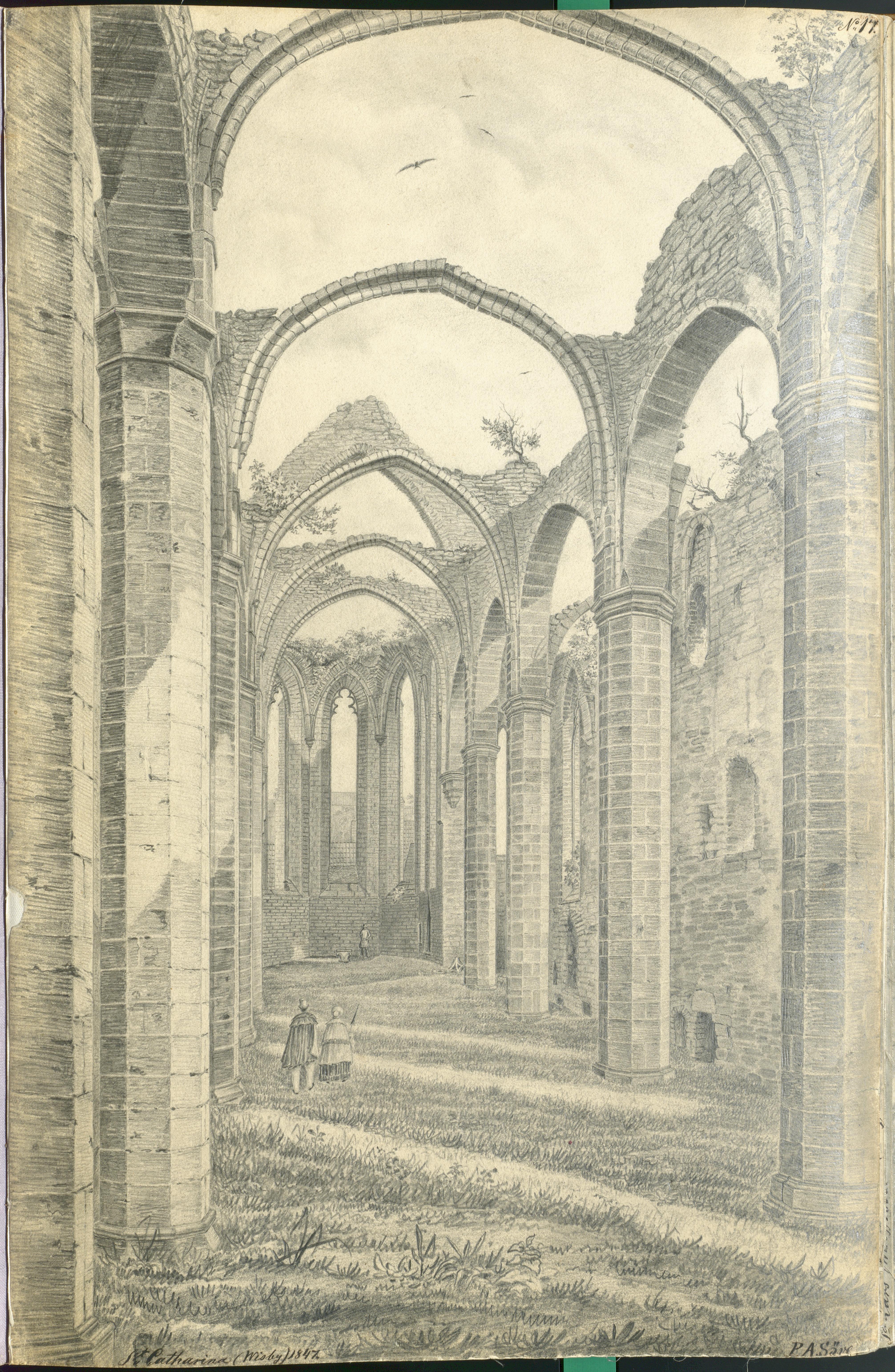 • RAÄ-nummer Visby 57:1. Interiör mot väster. Teckning av Per Arvid Säve 1847.