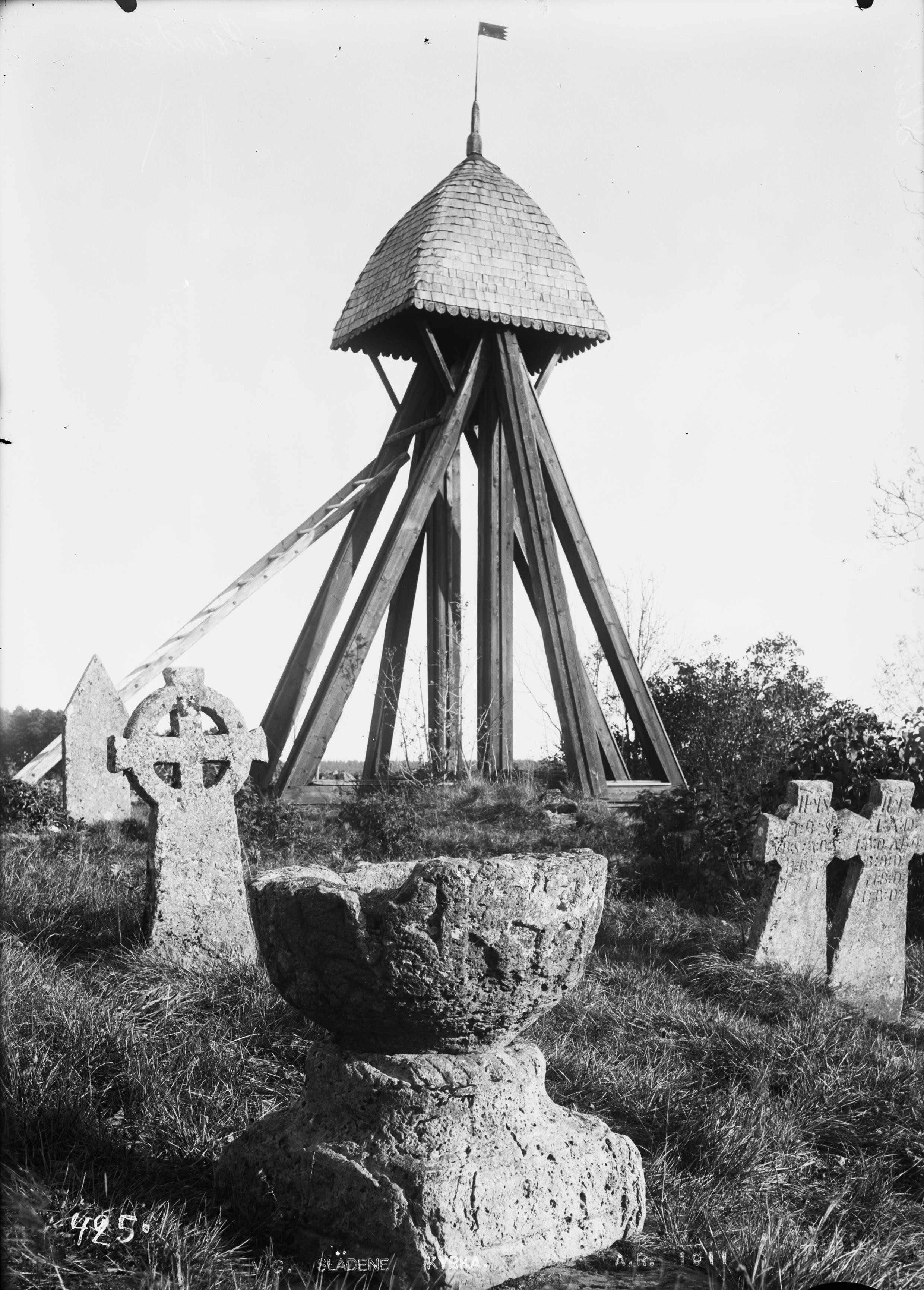 • Klockstapeln och kyrkogården med en dopfunt i förgrunden.