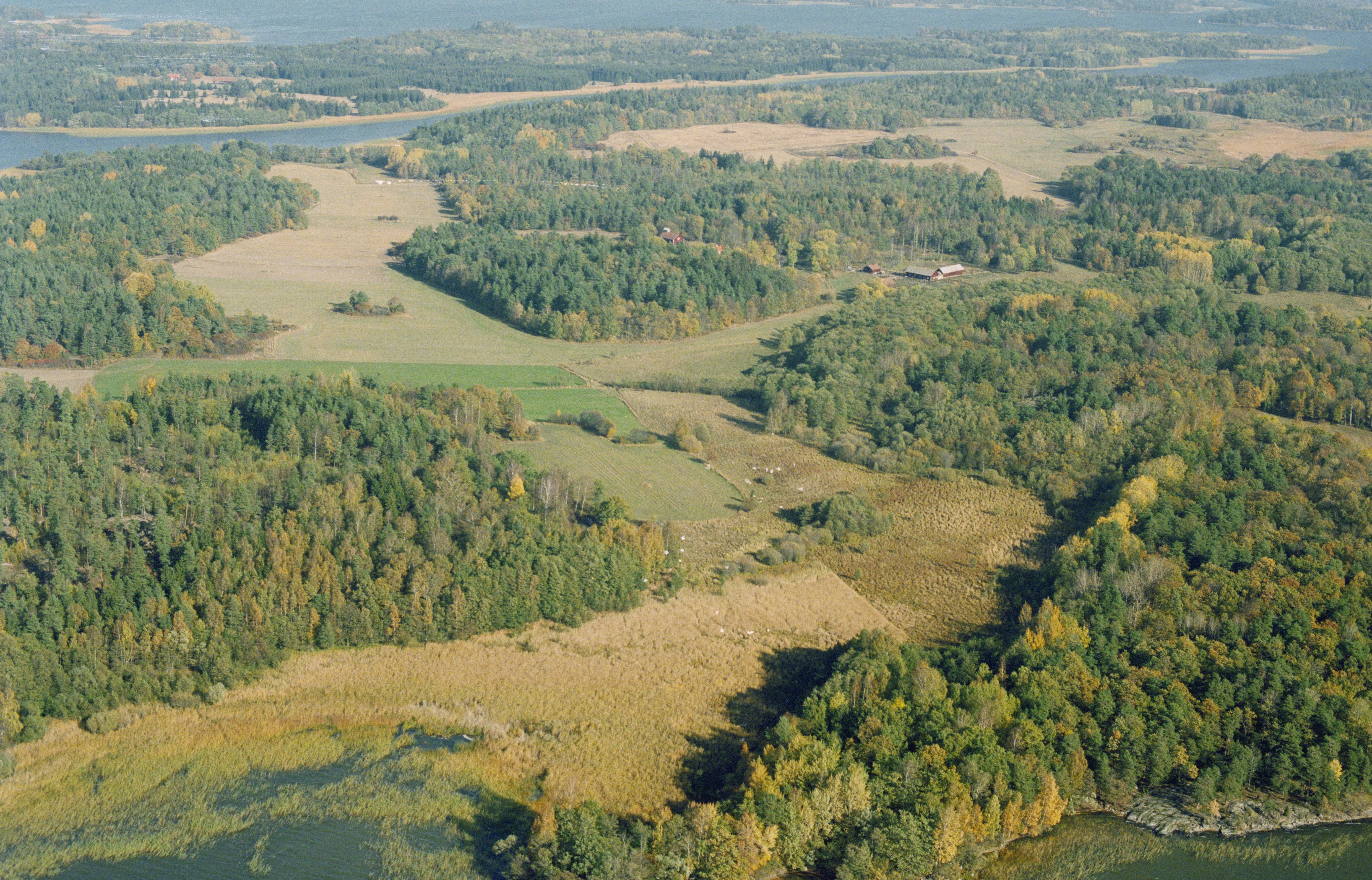 • Ön Långholmen i Mälaren. Vid bildens mitt gården Stora Långholmen. Vid stranden uppe till vänster vattenområde med båtlämning RAÄnr Ängsö 43. Bilden är tagen mot (väderstreck): NO