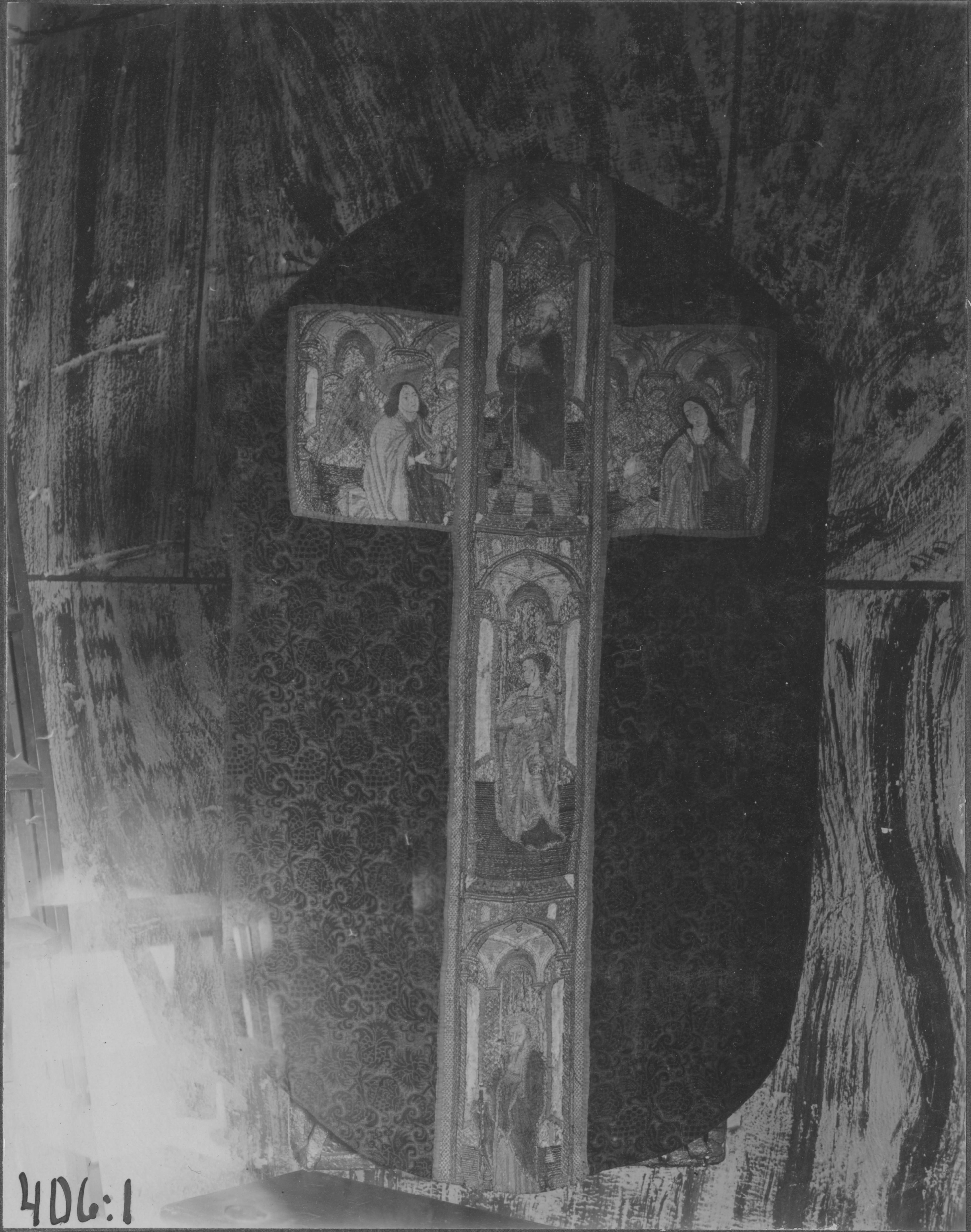 • Mässhake av grön sammet med kors prytt med helgon och änglar. Ryggstycket. Medeltidens slut.