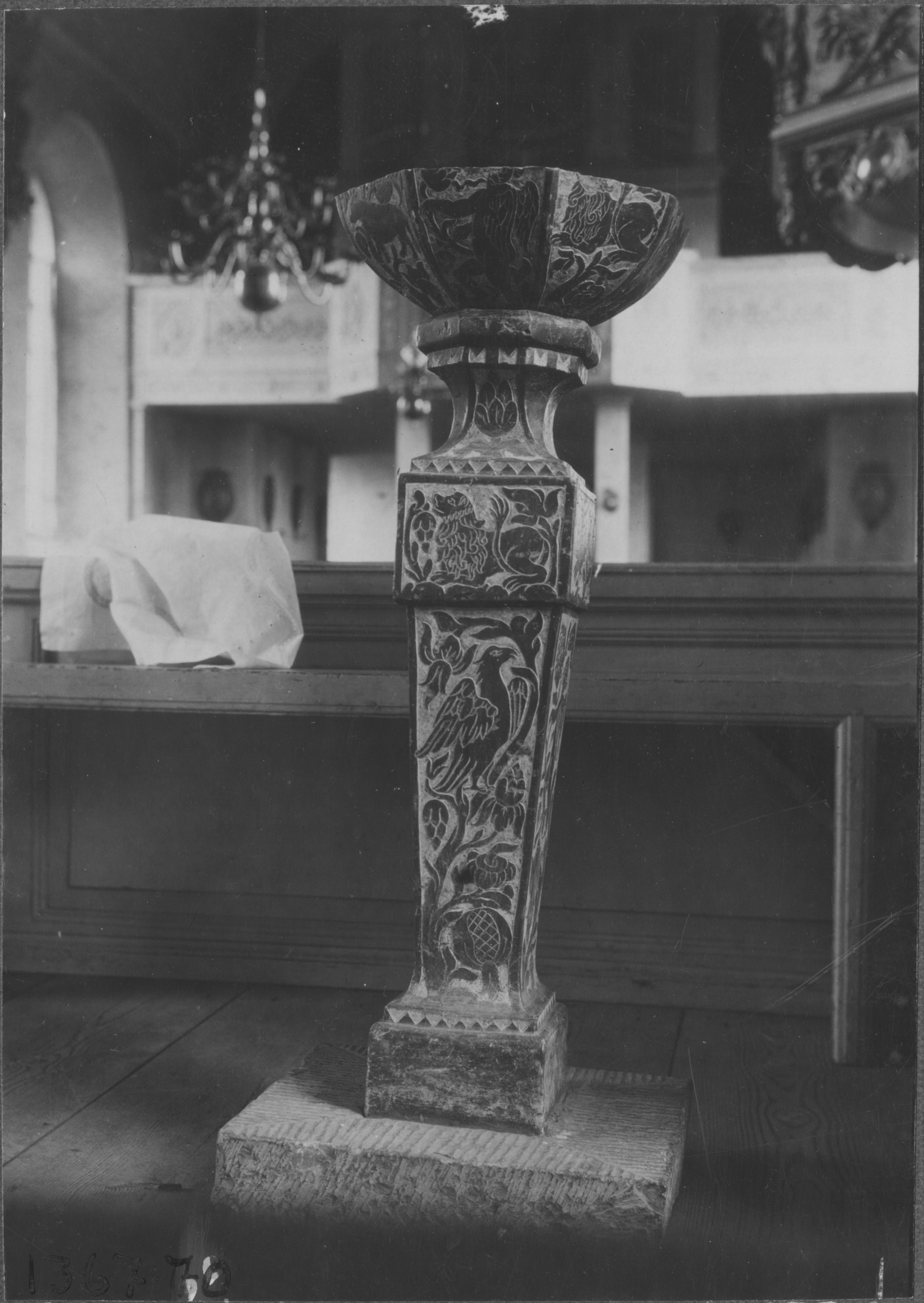 • Dopfunt av kalksten. Ornerad med djur, växter och änglar i plattrelief, röda mot grå botten. 1600-talets senare del. Snabbinventering.
