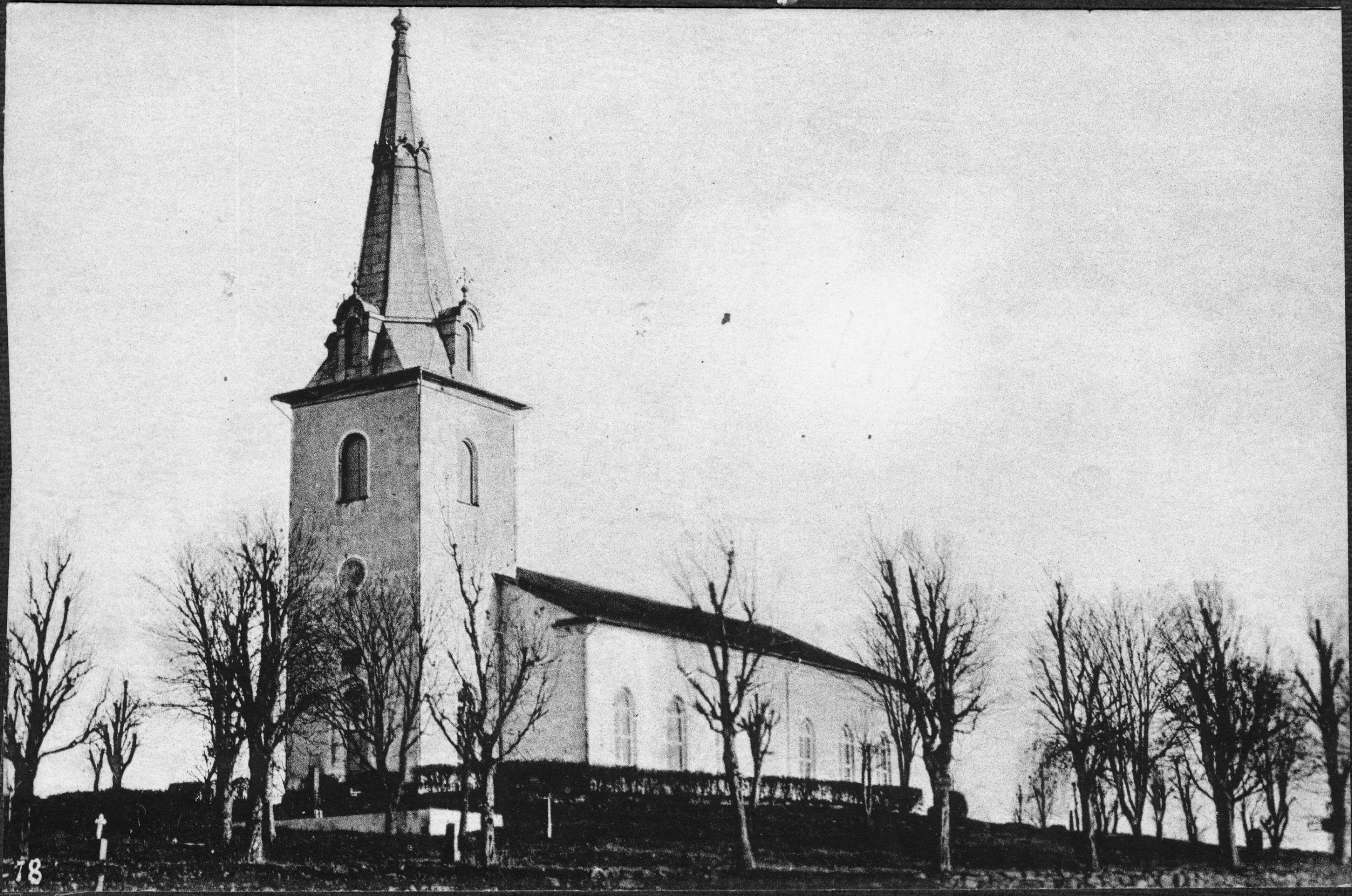 • Kyrkan från sydväst. Västtorn med spira.