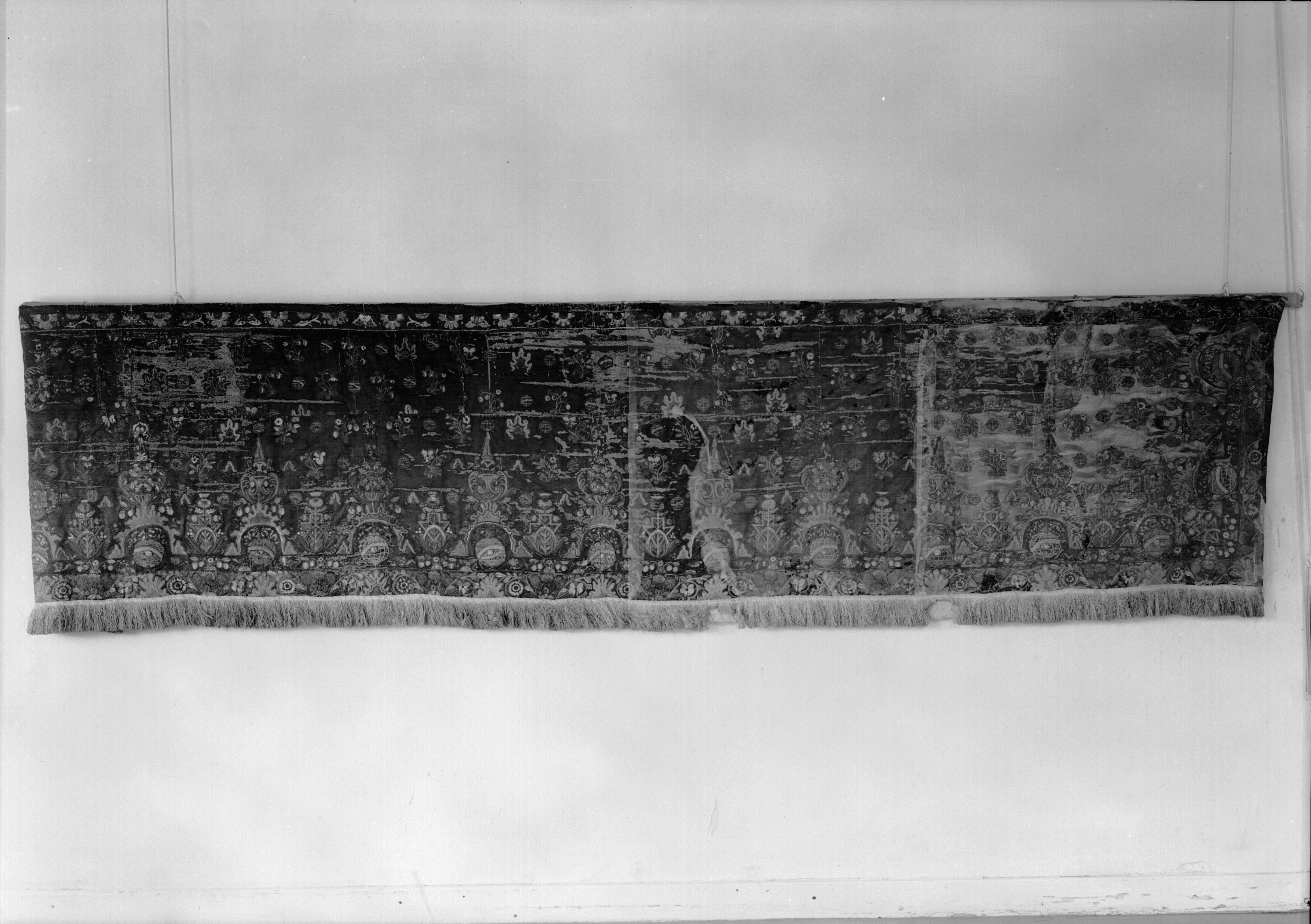 • Antependium av rött siden, broderier i guld och silver, flerfärgat silke, 1600-talets början. Före konservering.
