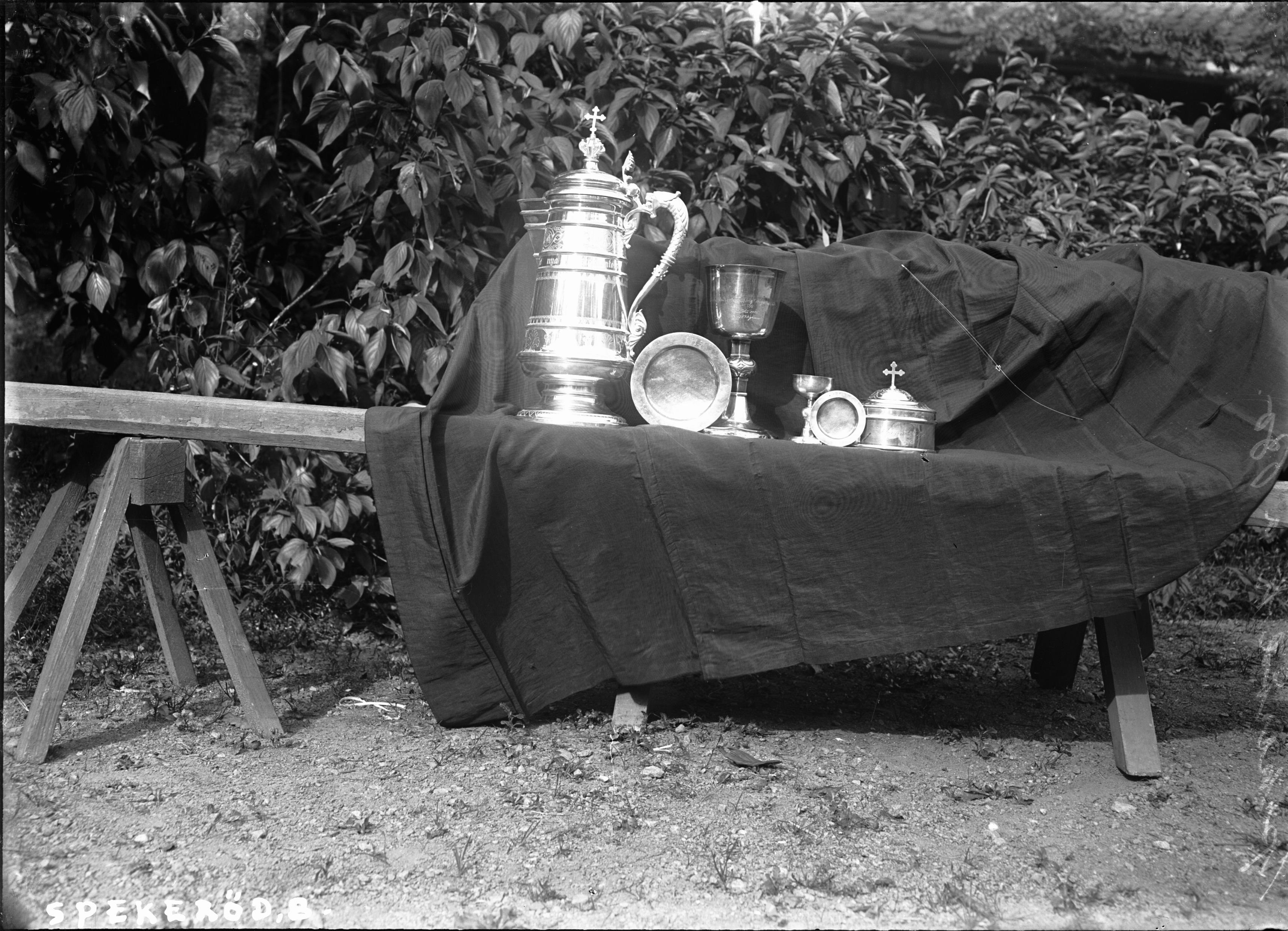 • Vinkanna av nysilver, modern. Patén av silver, modärn. Kalk av silver med förgyllningar, Gjord av Anders Höberg, Göteborg år 1697. Tillverkad år 1790? och år 1905. Sockenbudstyg av kalk av silver, patén av silver och oblatas av silver. Snabbinv.