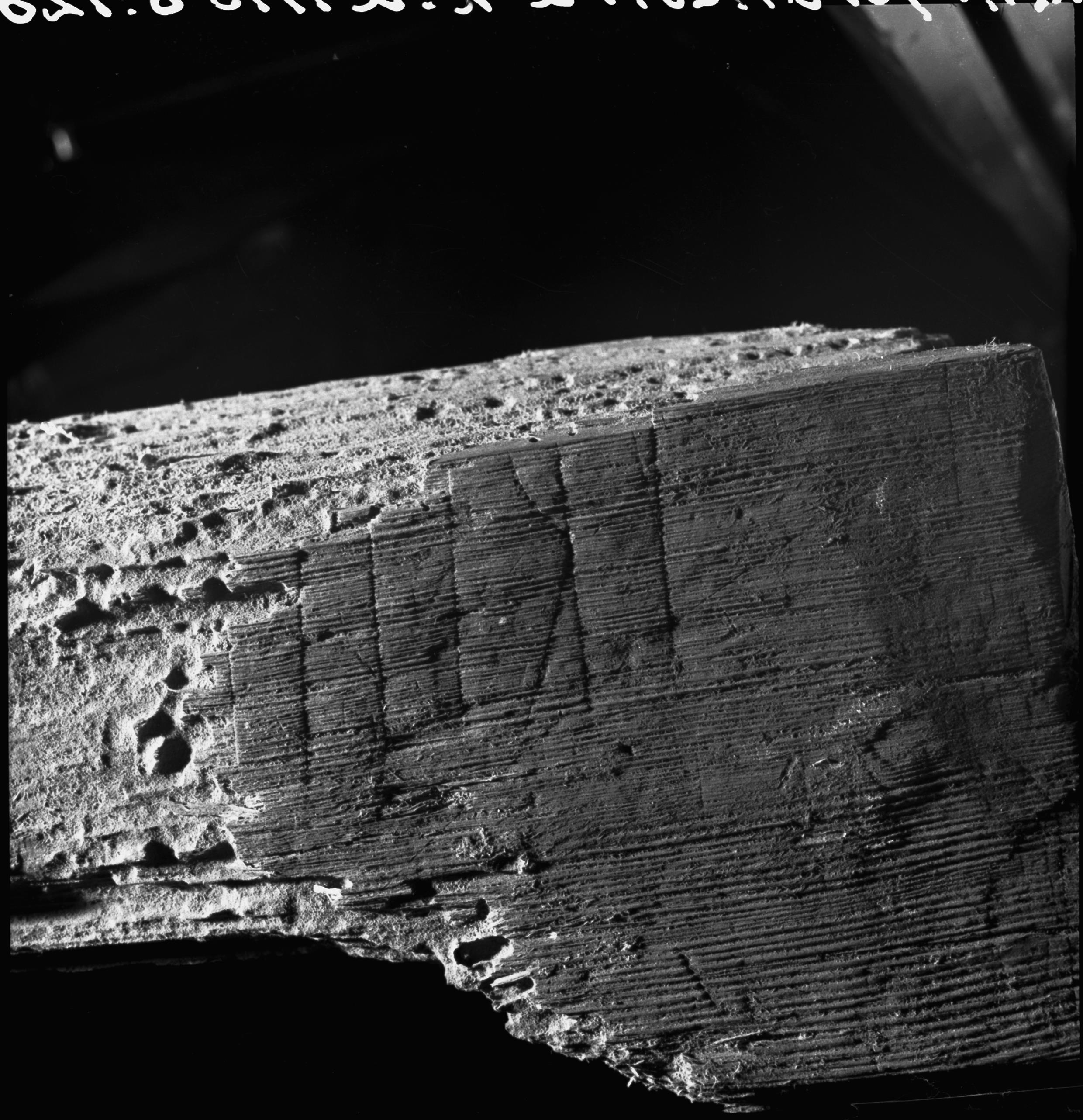 • Medeltida stockar med runinskrift på vissa, från gamla kyrkan, funna under restaurering 1910. Detalj.