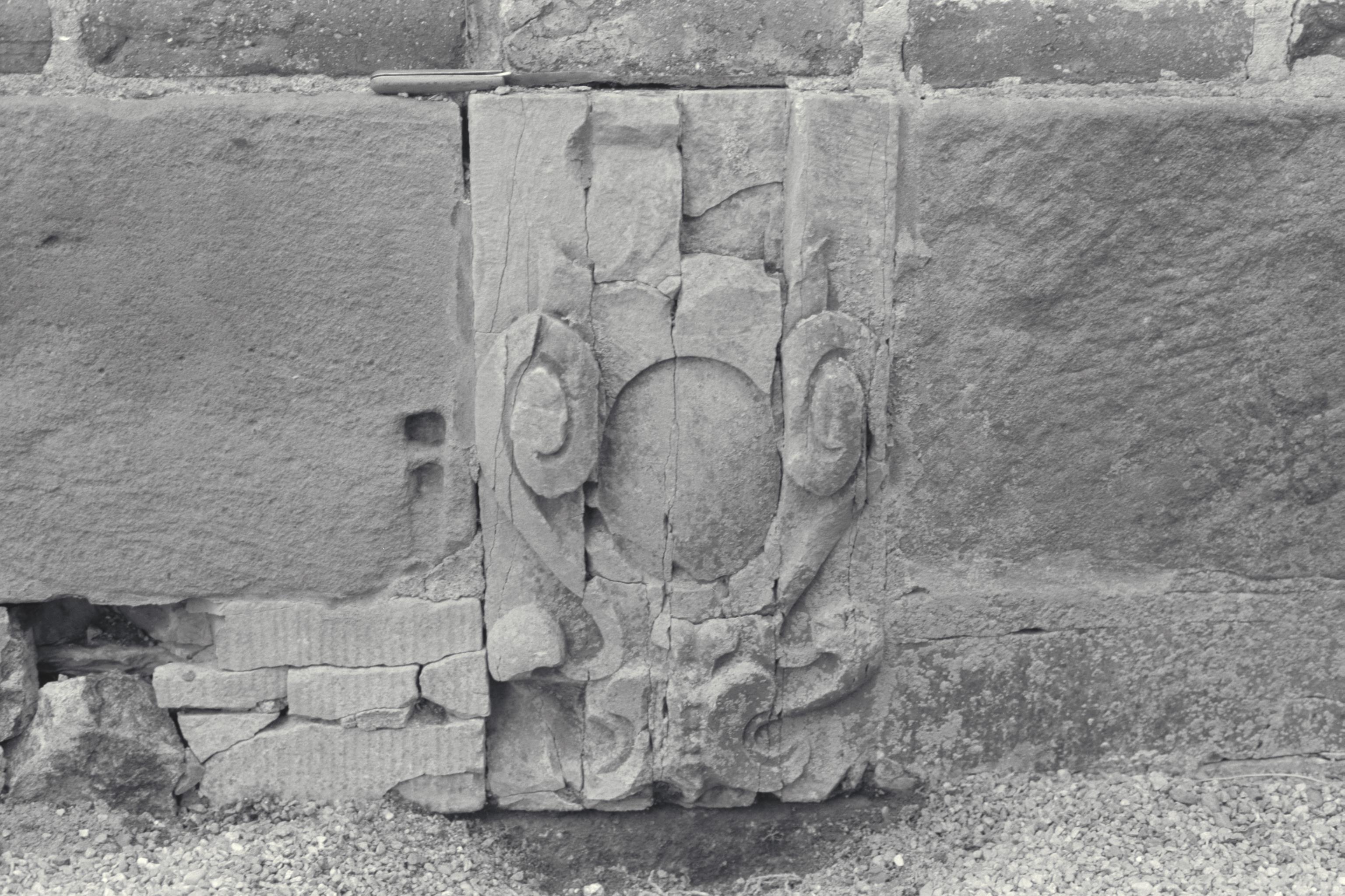 Stiglucka norr om kyrkan. Kartusch- och broskverksornamentik Fotosyfte: Inv/dok