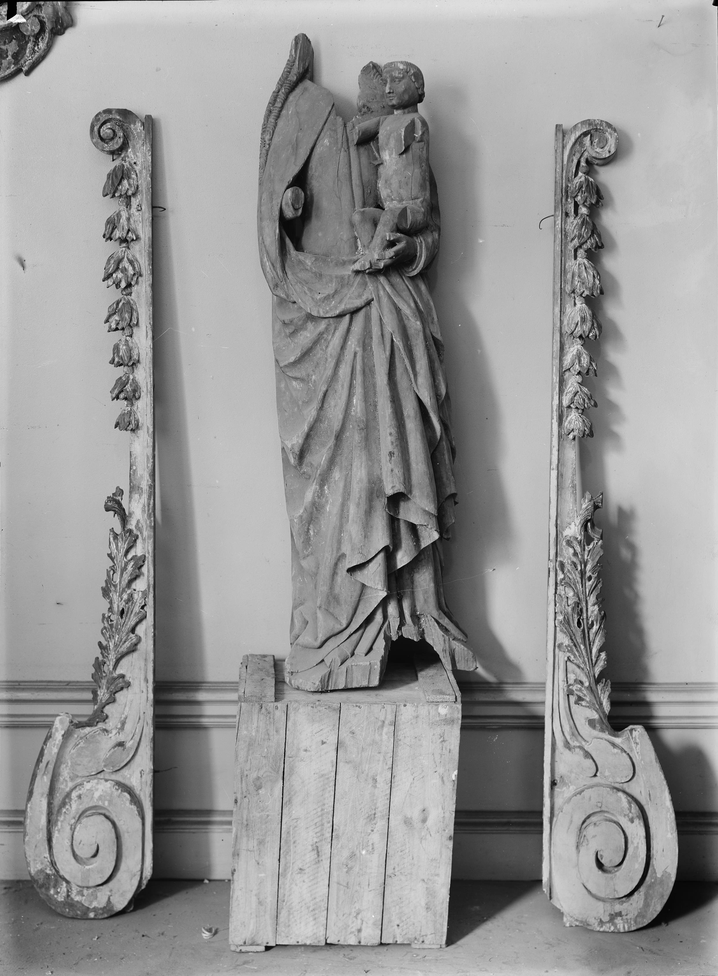 • Maria med barnet, bild av björk. Maria står och håller barnet på vänster arm (snabbinv.). Illa åtgången. Från 1400-talet.