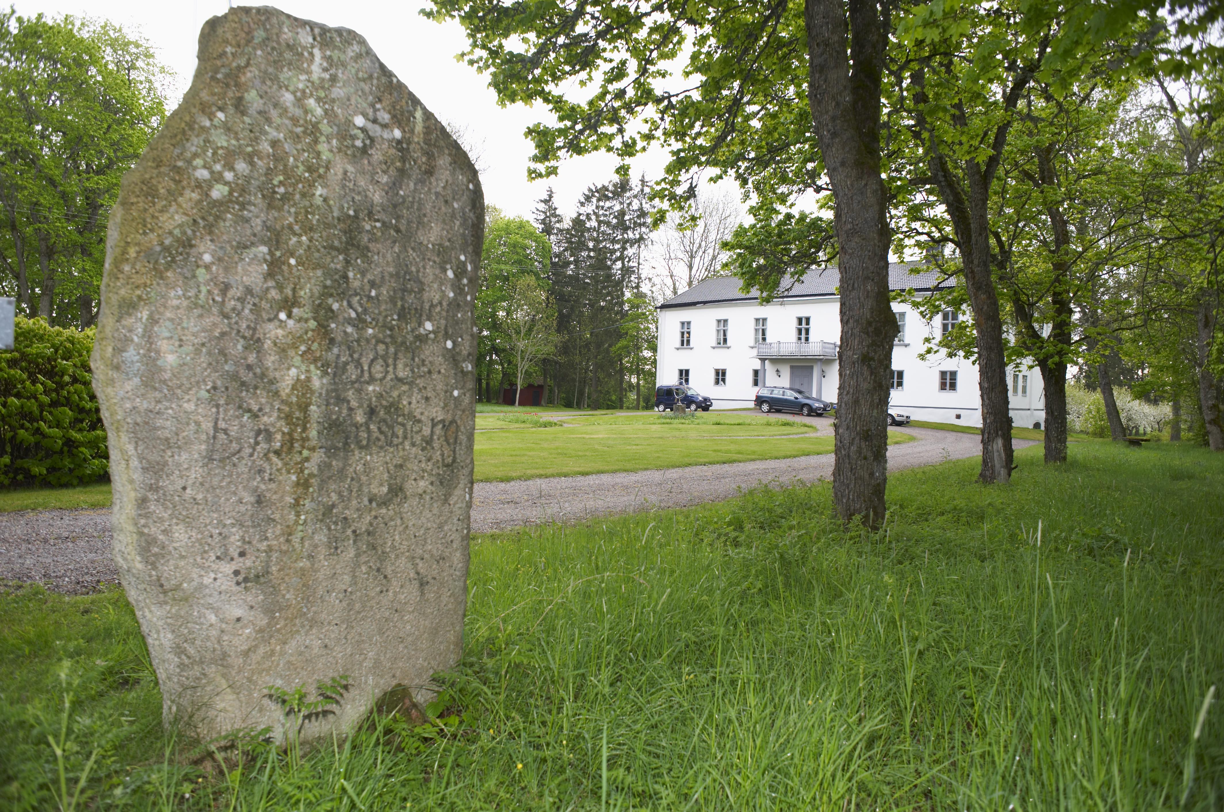Runstenen är känd sedan 1600-talet. När den då ritades av fanns ännu det nu förlorade toppstycket. Under en period var hela runstenen försvunnen, men 1880 flyttades den från en"gammal tomt" öster om nuvarande huvudbyggnaden och restes. Inskriften är mycket grunt huggen.Stäng