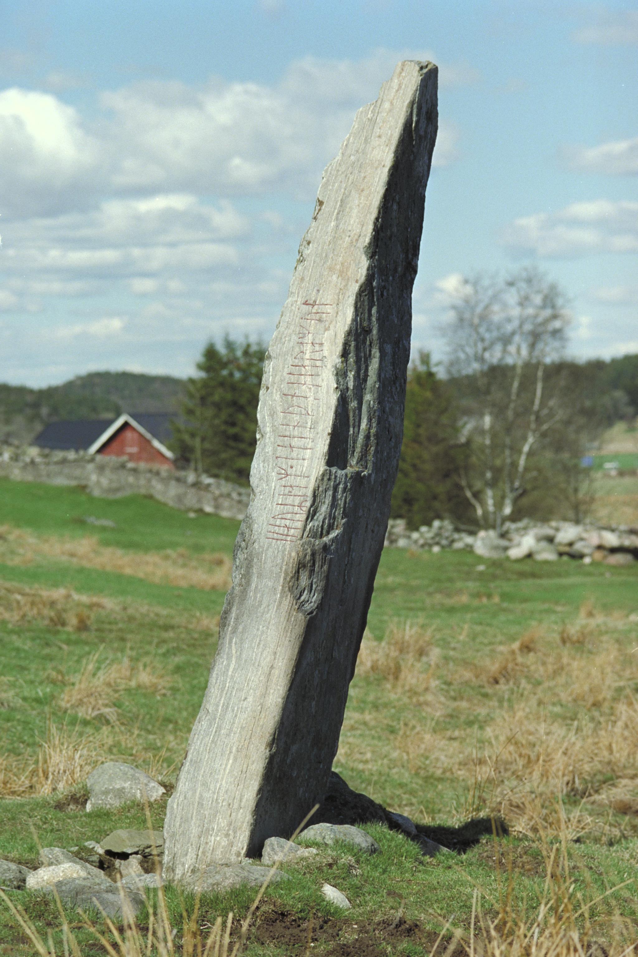 Nikon F4. Några exponeringar med polfilter. Bäst bel. tidig förmiddag el. kväll. Hög och smal runsten med kort ristning. Om tolkningen se Lena Peterson i Blandande runstudier (1992), s. 81ff.