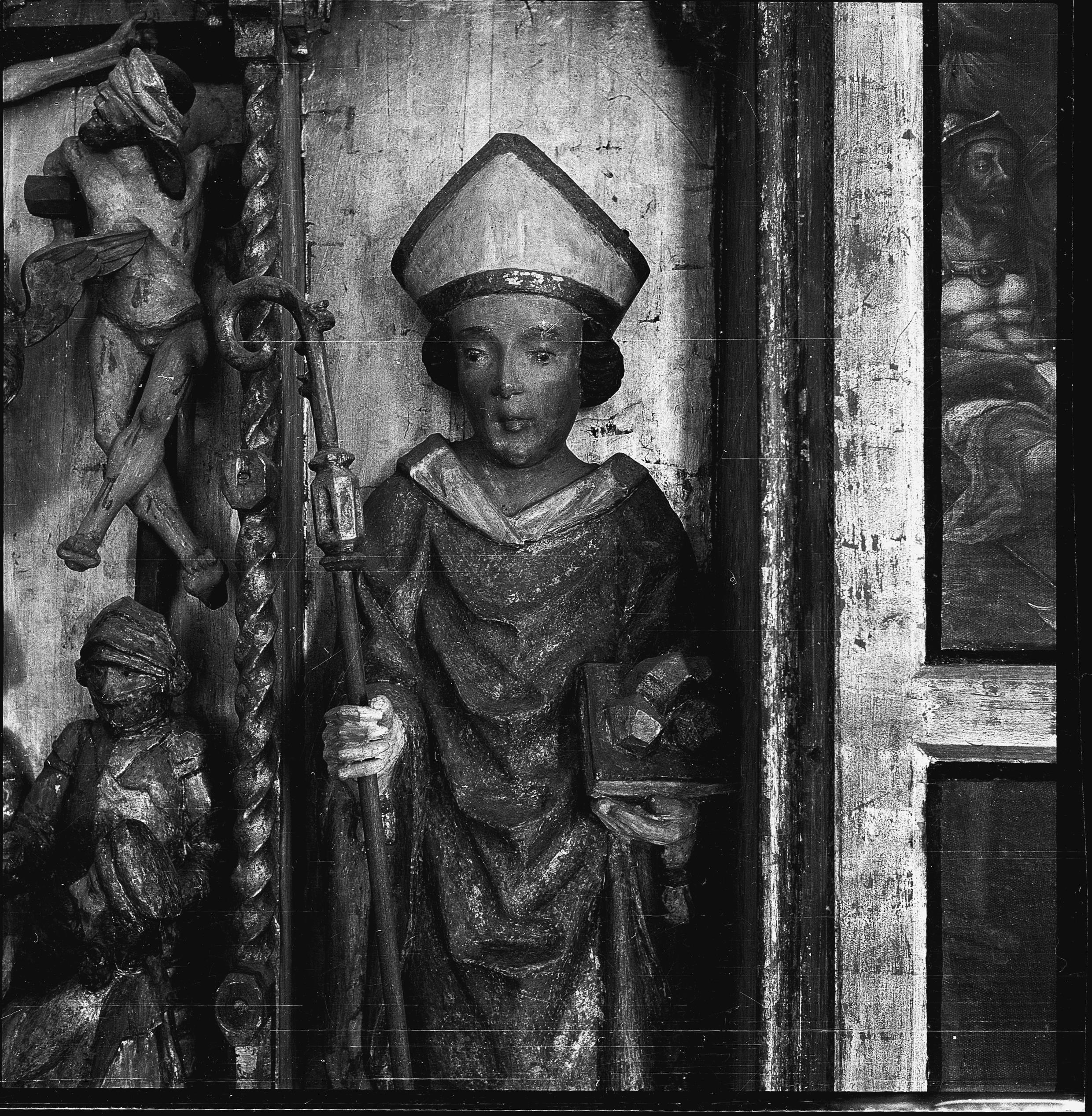 • Altarskåp med medeltida mittparti, svenskt arbete föreställande korsfästelsen. Detalj av Biskop Eskil.