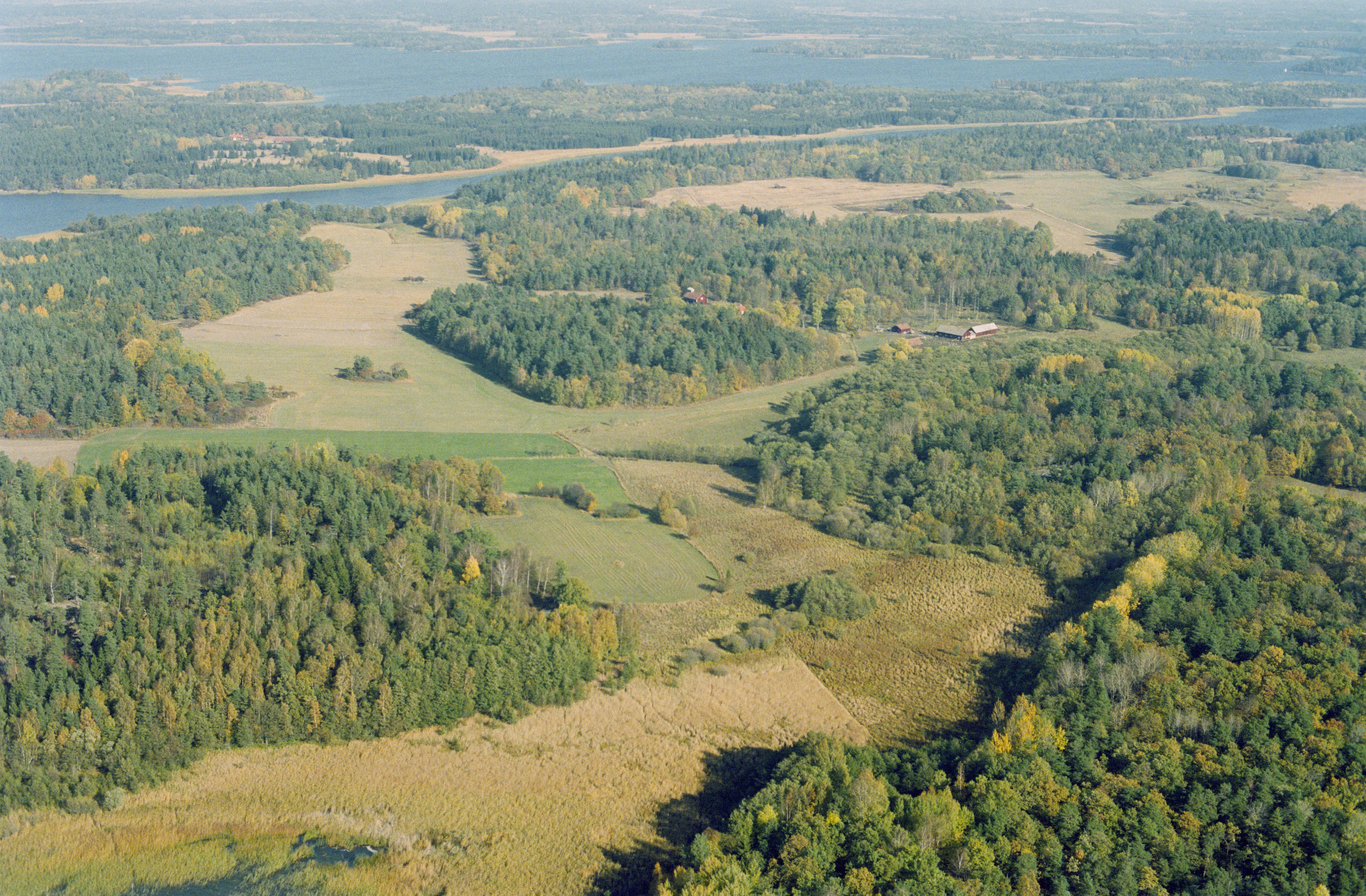• Ön Långholmen i Mälaren. Vid bildens mitt gården Stora Långholmen. Vid stranden uppe till vänster vattenområde med båtlämning RAÄnr Ängsö 43. Bilden är tagen mot (väderstreck): NO
