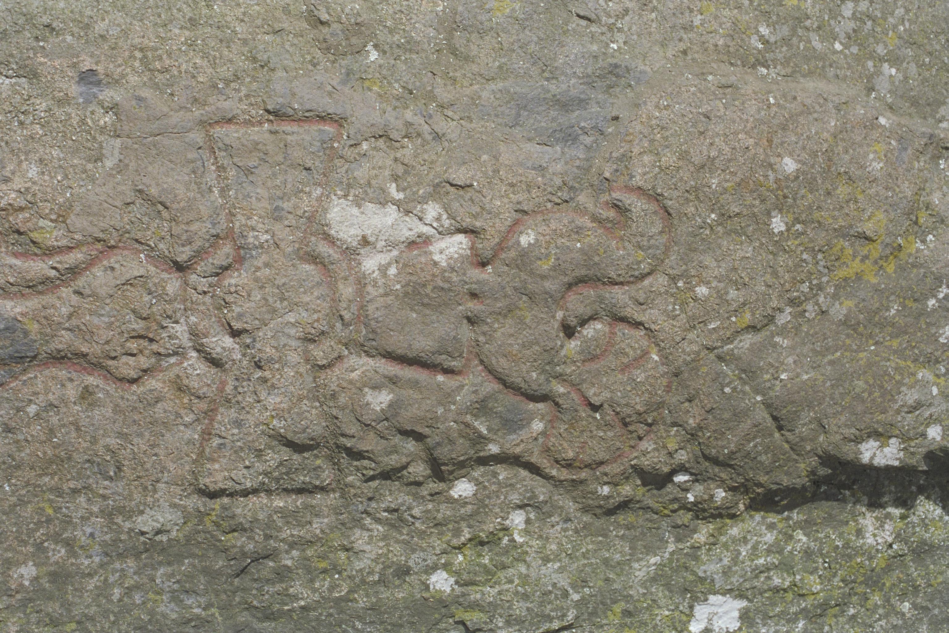 Deltaljbild av tuppen på runhällen Sö270. Fotosyfte: Inv/dok