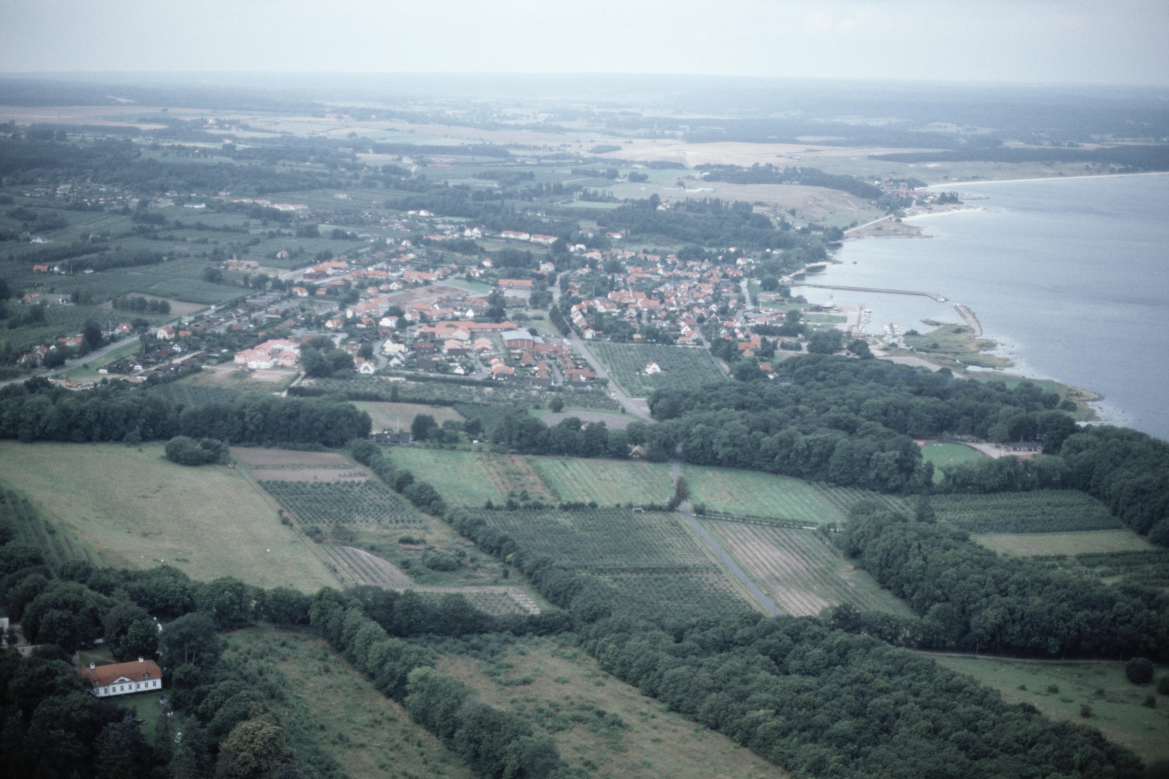 • Tätorten Kivik. Kungagraven RAÄnr Södra Mellby 42:1 Kiviksgraven (Bredarör ) vid bildens mitt. Bilden är tagen mot (väderstreck): NV