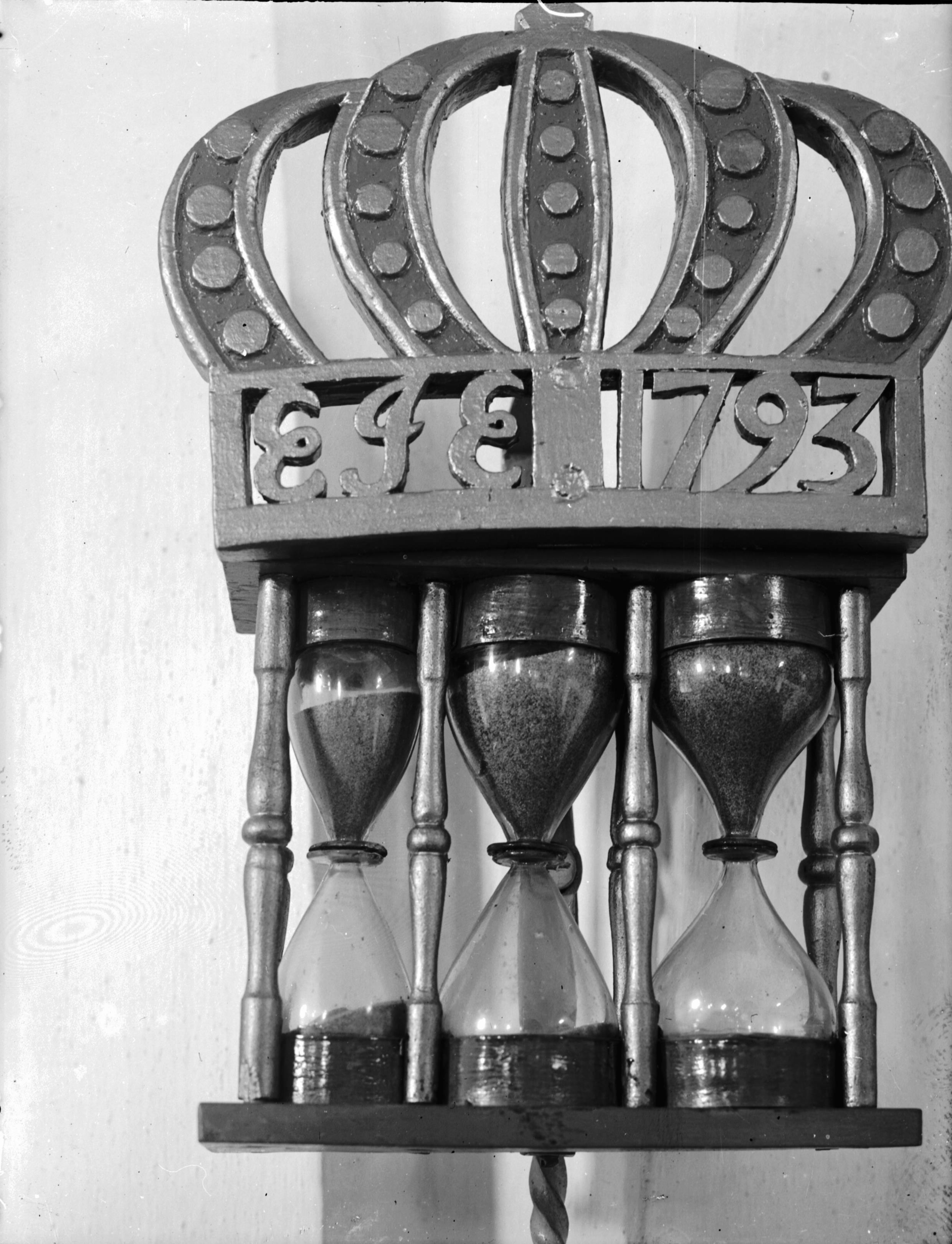 • Timglas, tre glas i träställ, med årtalet 1793. Snabbinv.
