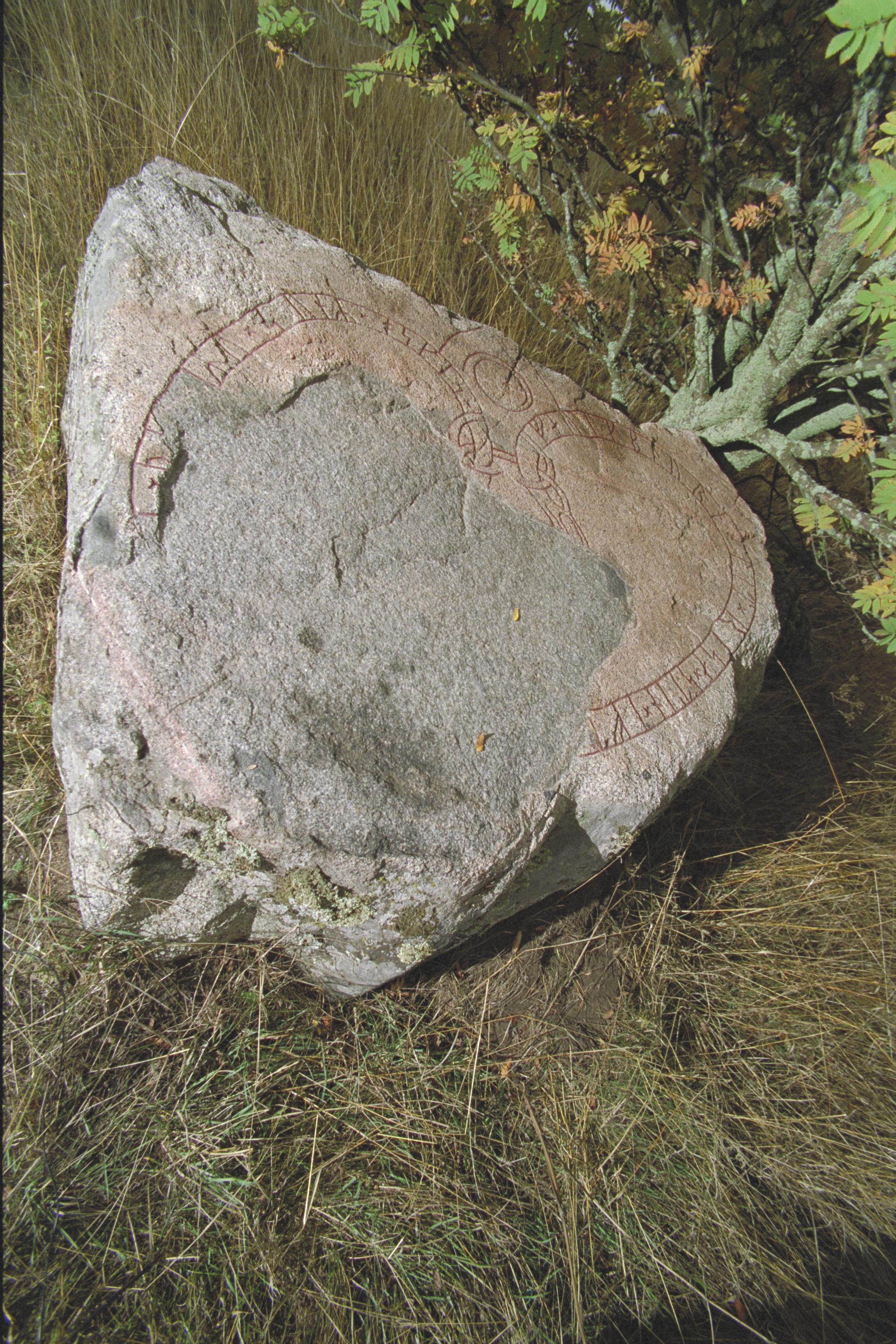 Duggregn vid fototillfället. Liggande sten under ett träd. Svår tagning. Trädet bör fällas, därefter kan tagning göras från stege. Ytterligare bilder finns, oregistrerade, tillsammans med negativen. (Färgdia 6x6 cm, runstenen i sin helhet, ej detaljbilder.)