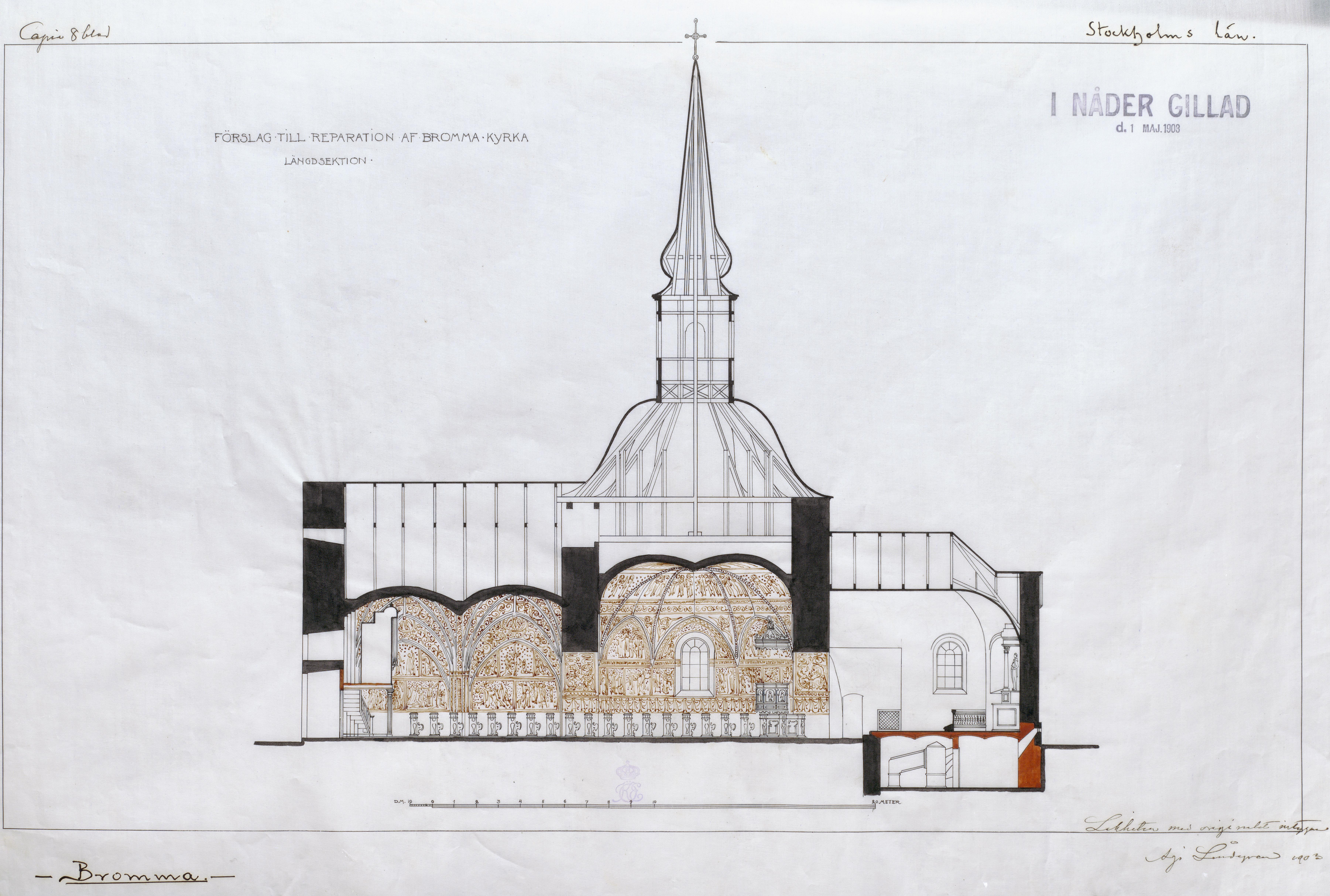Ritning, utförd 1903 av Agi Lindegren. Längdsektion, förslag till reparation av Bromma kyrka. Reproskanning av originalritning. Fotosyfte:
