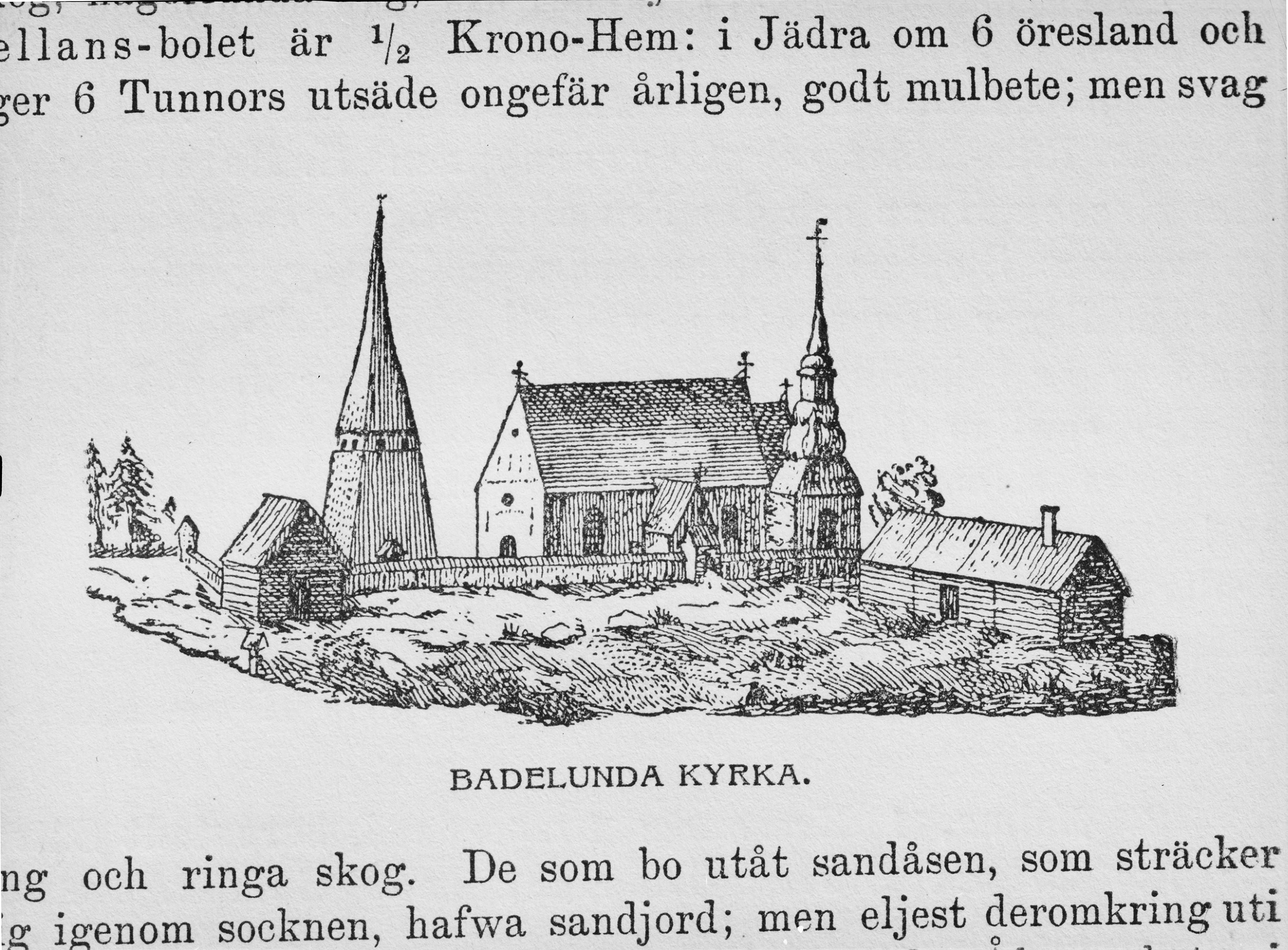 • Kyrkans exteriör. Foto av Olof Graus teckning ur "Beskrivning över Västmanland" från 1700-talet. Efter konservering.