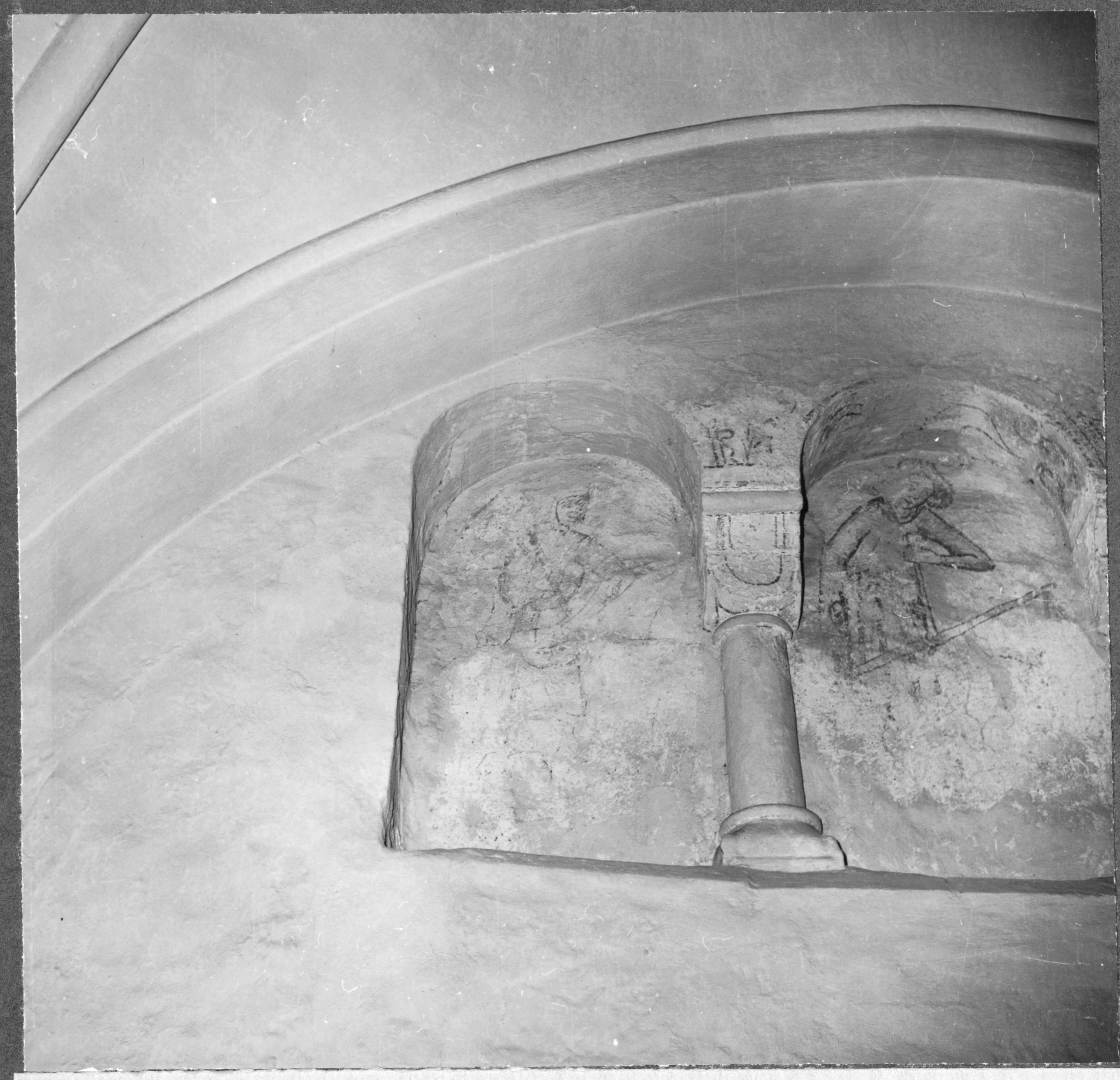 • Kalkmålning, långhusets västra vägg, södra sidan. Kalkmålningarna i kyrkan är daterade från 1100-talet till 1400-talet.