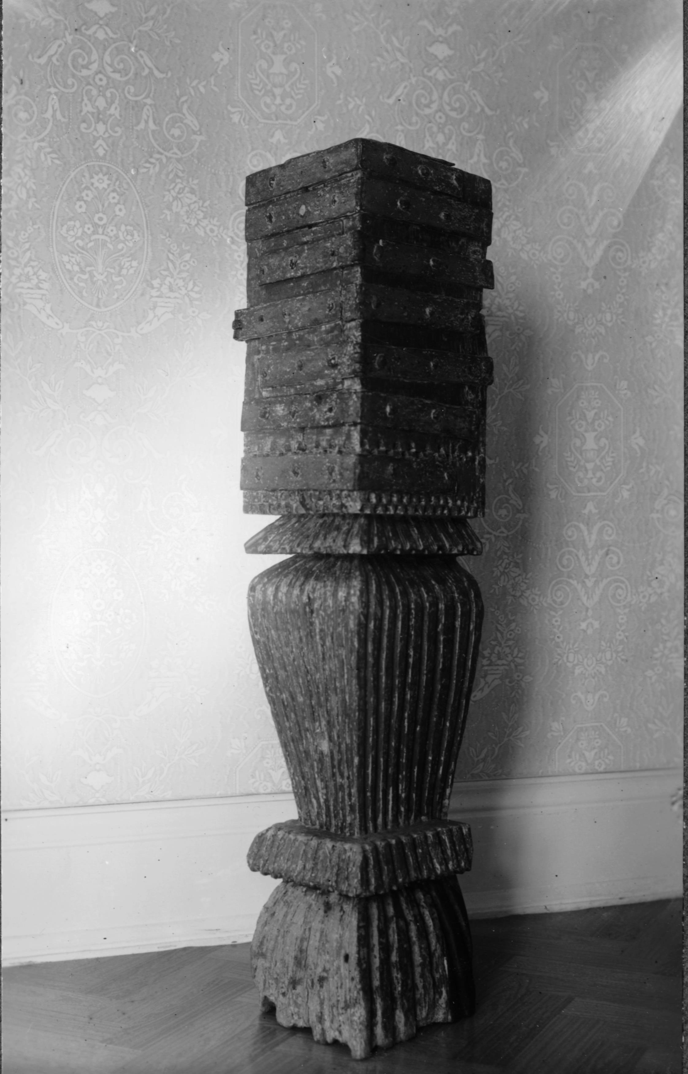 • Gamla fattigstocken, av ek, med framtagen men ej förbättrad äldre färg, 1600-tal. Efter konserveringen.