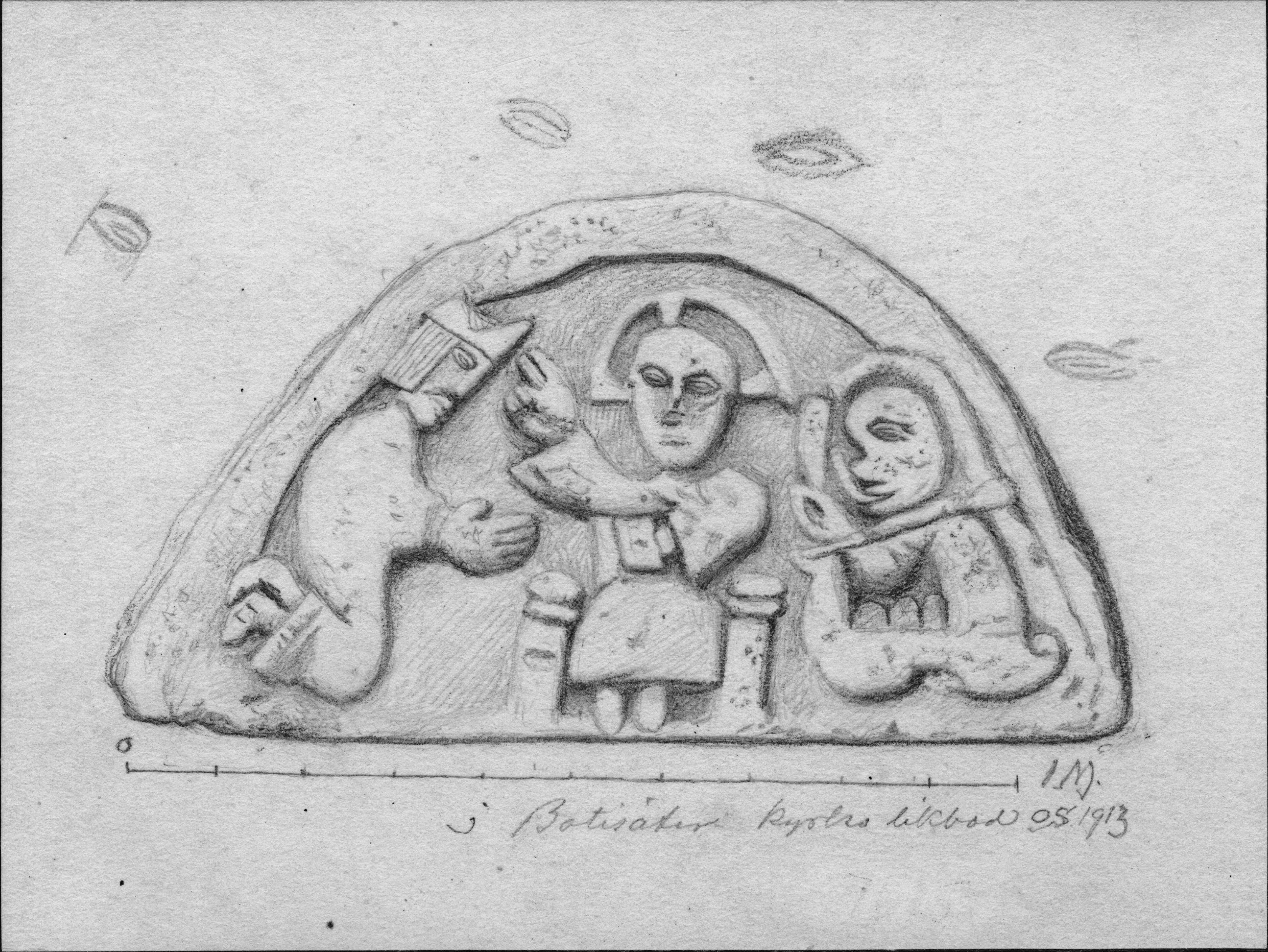 • Tympanon, medeltida. Teckning av Olof Sörling.