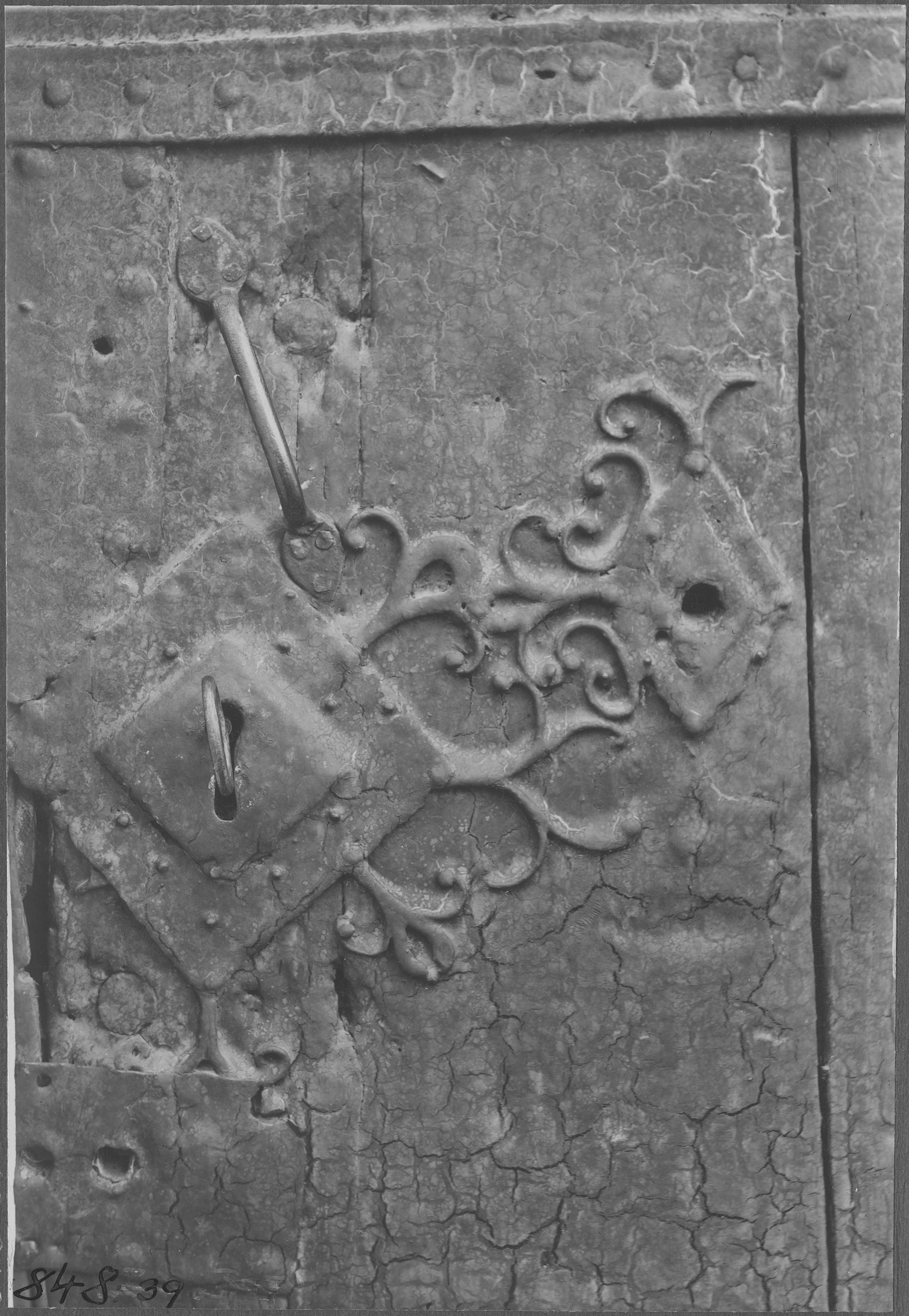 • Detalj av medeltida järnsmidd dörr till stenbyggnad från 1200-talet på kyrkogårdens södra del, tidigare tiondebod, nu gravkapell sedan 1950-talet.