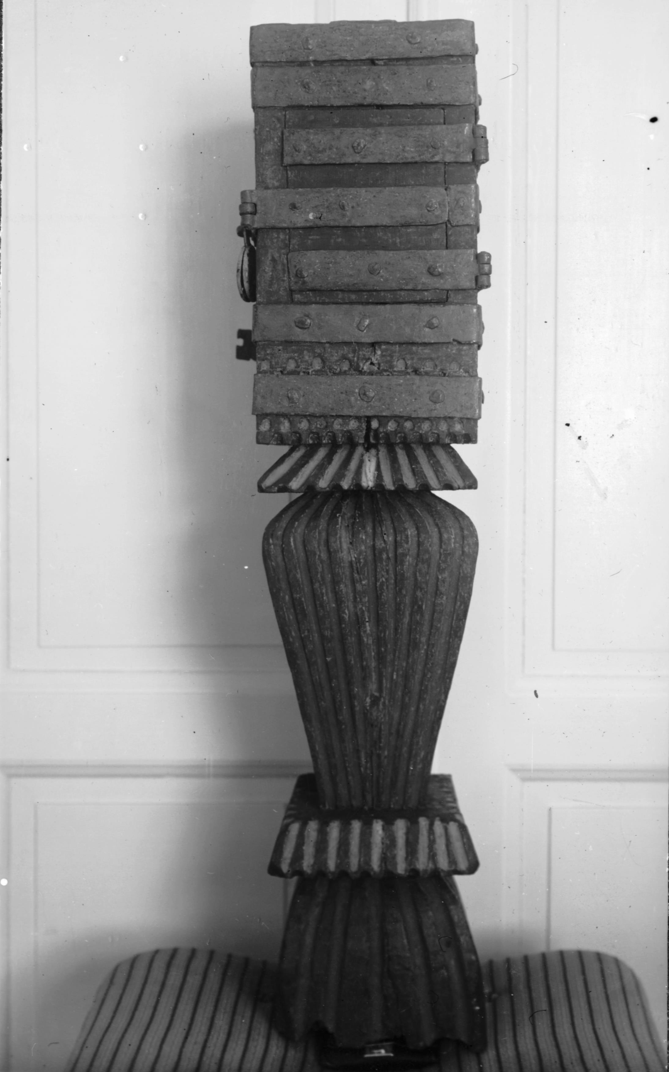 • Gamla fattigstocken, av ek, med framtagen men ej förbättrad äldre färg, 1600-tal. Efter konserveringen.