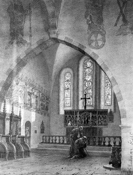 • Interiör mot öster. Efter akvarell av Johan Kahl 1872. Privat ägo.