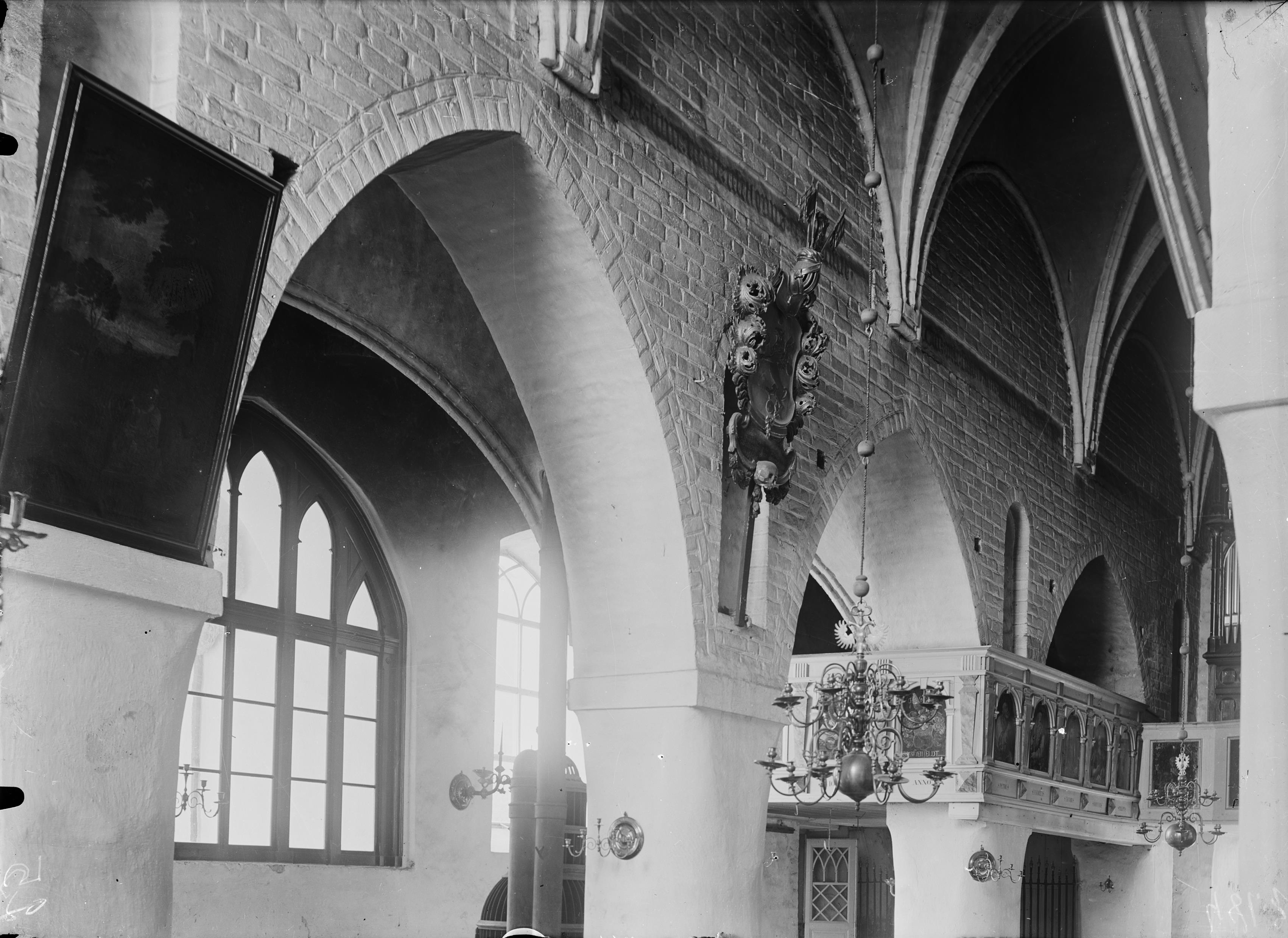 • Interiör mot kryssvalven, pelarna och arkadbågarna med läktare.