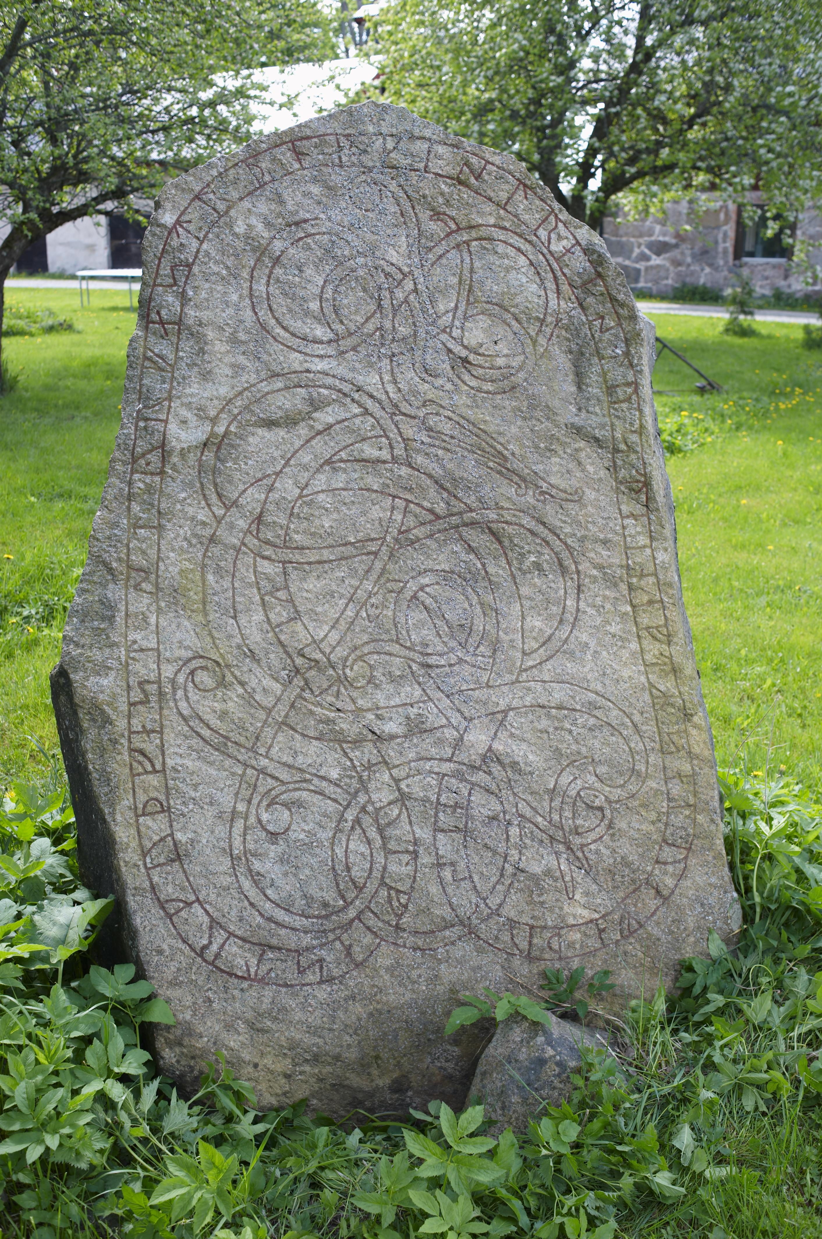 Från 1000-talet e. Kr. Inskriften lyder: " Gisl, Holmfast, Gudfast, Styrfast, Torgisl reste stenen efter Salve sin fader". Fotosyfte: Dokumentation