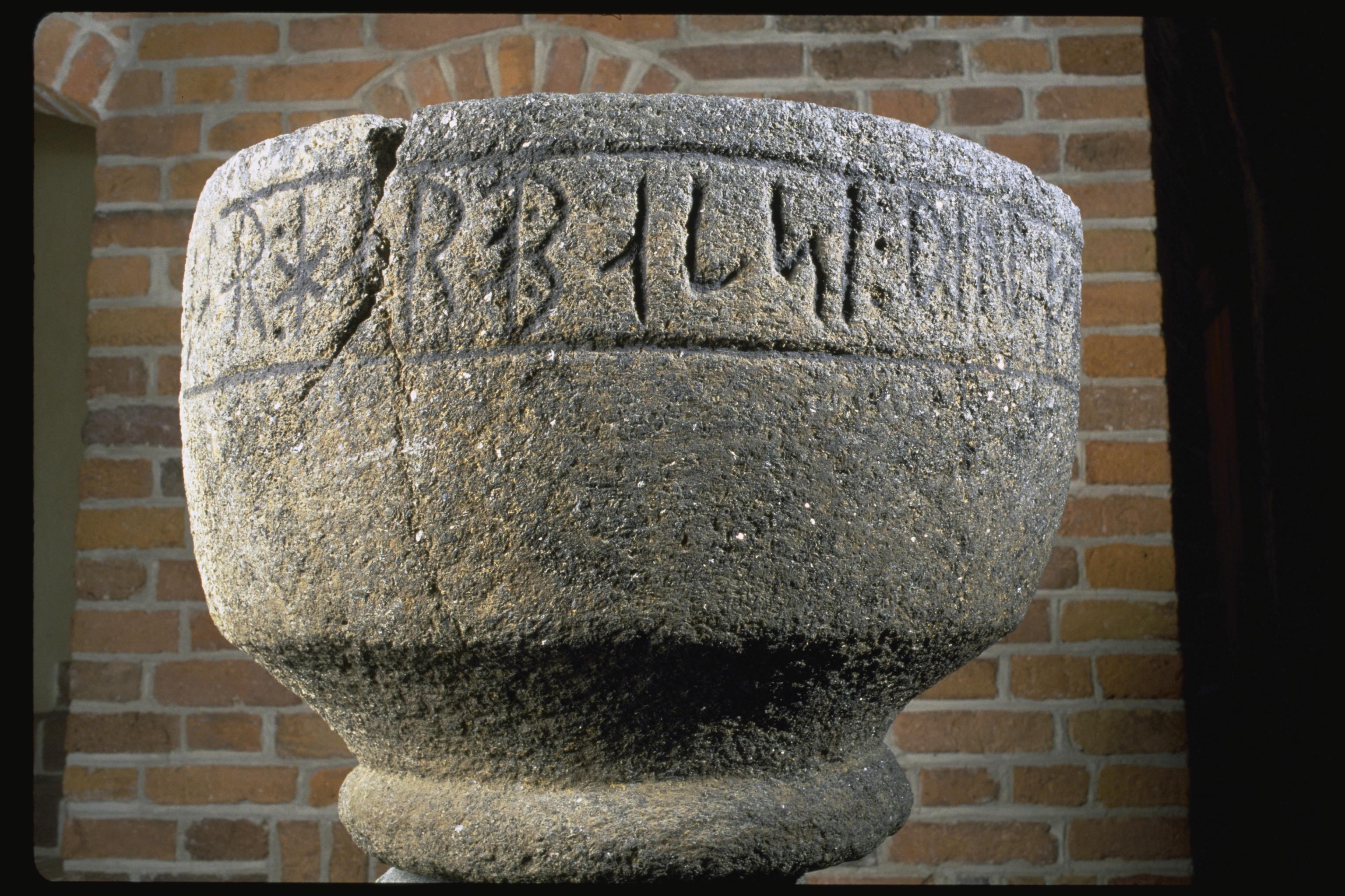 Dopfunt med runor, Vg244 Hemsjö, fotograferad i Stockholms stadsmuseum, förvarad i Stat Hist Mus (3986). Inkskriften lyder: Alla själar här döpas in i församlingen genom mig, skålen. Fotosyfte: Publicering/interaktiv media