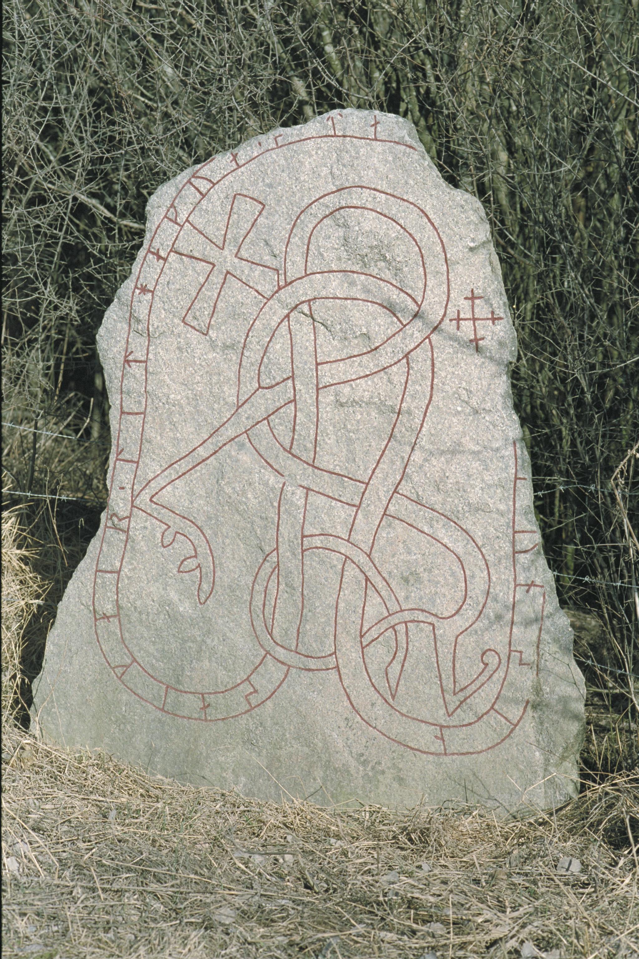 Stenen står vid en vägkant, något skymd och inträngd i ett slånbärssnår, taggtråd på baksidan. Måste fotograferas före grönskan. Ristningen mot väst. Ytterligare bilder finns, oregistrerade, tillsamma...