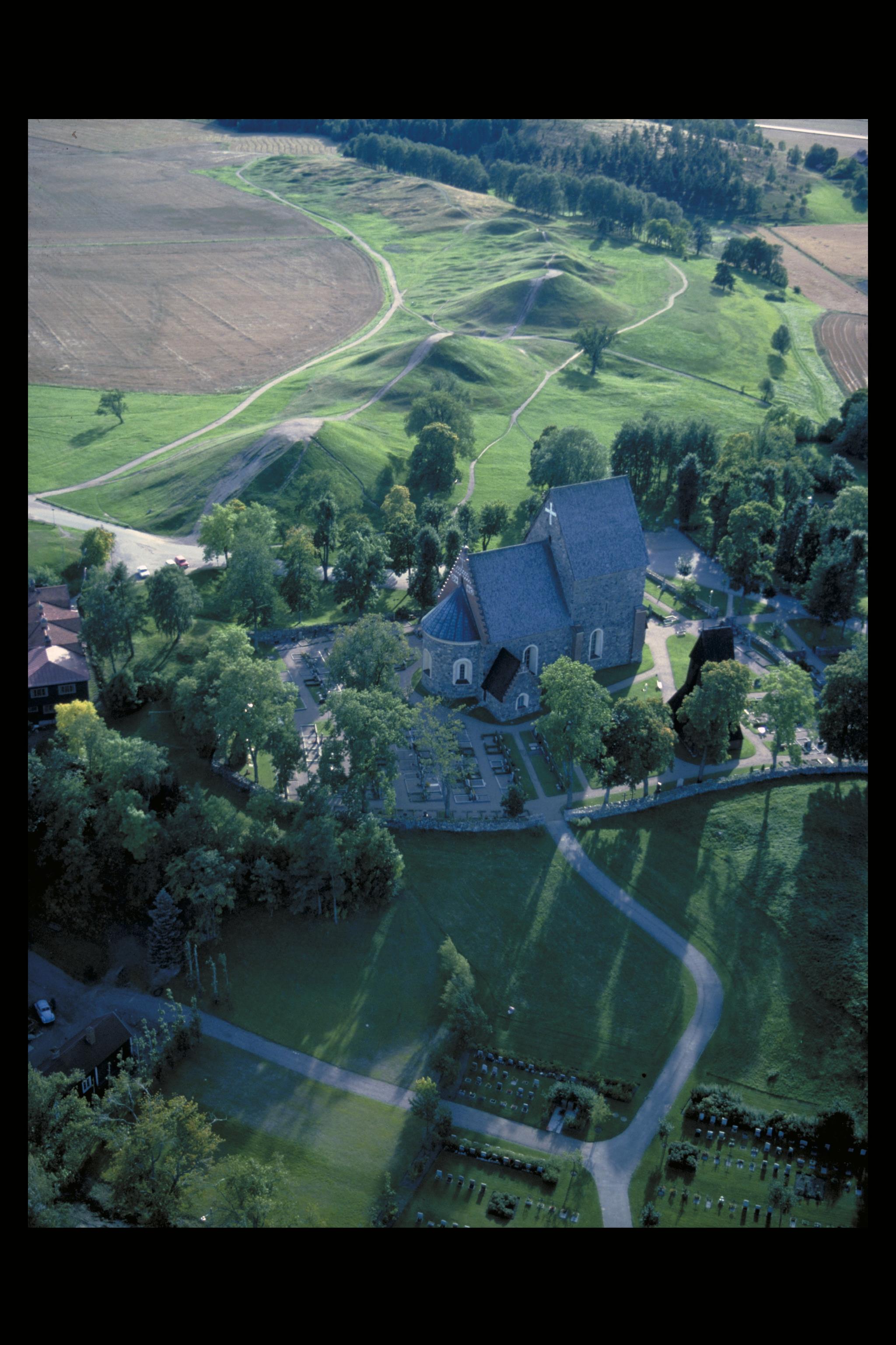 Kungshögarna och Gamla Uppsala kyrka. Bilden troligen från början av 1960-talet. Fotosyfte: