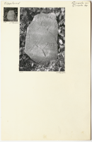 Runsten, röd sandsten, 1,2 m hög, 0,75 m bred (Ö-V), 0,07 m tjock. Runhöjd 8 cm. Stenen hittades för 35 år sedan i diket ÖNÖ om kyrkogårdsmuren ungefär mitt för kyrkans ÖNÖ gavel. Dnr 301/69.  Enligt Upplands runinskrifter lyder inskriften:"...lät resa stenarna efter Luden, sin son." Uppmålad 1968. För ytterligare information se det inskannade bokuppslaget under Referens.Stäng |