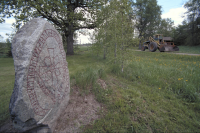 Runsten (U 1151), 1,50 m hög (Ö 30cg S-V 30cg N), 1,0 m bred och 0,33 m tjock. Runhöjd 6-9 cm. Ristningen vetter åt S. På ömse sidor står torra enbuskar. Enligt Upplands runinskrifter lyder inskriften:"Hedendis lät resa denna sten efter Holmfast, sin man, och efter Ängle, sin son. Gud hjälpe deras ande." Restes 1950. Uppmålad 1999.