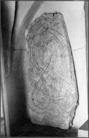 Ornerad sten, kalksten, 1.67 m h, 0.82 m br och 0.10 m tj. Stenenhar slingor av runstenstyp men inga runor. Slingorna är 5-10 cmbr. Stenen är fastsatt med krampor i en vägg i Lista kyrkasvapenhus. Den...