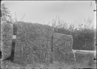 Runstensfragment, 0,69x0,78x0,09 m. Runhöjd 10-12 cm.  Enligt Östergötlands runinskrifter lyder inskriften:"(N.N. lade) denna (sten) efter Asa, sin hustru." |