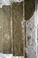 Liljesten, enkel, 1,72x0,49-0,63 m st och 0,16 m tj, av gulaktig sandsten. Dekormotiv: Livsträd på stam med hjärtpalmetter. Högra sidan av stenen är dold av femte trappsteget. Trappan leder till den ...