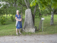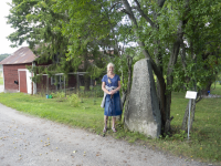 Runsten, ljusgrå granit, 2,09 m h, 0,4-1,0 m br (N-S) och 0,57 mtj. Runristning på 2 sidor den åt Ö och den åt N vända. Runhöjd7-9 cm. Den på Ö sidan är tydlig och välbevarad, den på N-sidanär delvis ...