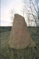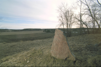 1) Runsten, röd granit, 1,6 m h och 1,35 m vid basen och avsmalnande uppåt. Stenen står i SÖ-NV. Ristningen vetter åt NÖ. Runhöjd5-6 cm. Stenen är obetydligt skadad i toppen. Ca 10 m VNV om nr1 är: 2) Stensättningsliknande lämning, belägen på låg moränförhöjning. Lämningen är 3-4 m diam och 0,2 m h. Övertorvad med i ytantalrika 0,2-0,4 m st stenar. Beväxt med 1 kraftig ek. Beskrivningen är inte kvalitetssäkrad. Information kan saknas, vara felaktig eller inaktuell. Se även Inventeringsbok.