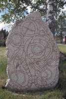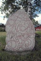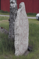 Runsten granit 1,75 m h, 1,1 m br (NV-SÖ) och 0,2 m tj. Avsmalnande uppåt med avskuren topp. På NÖ sidan ristningen. Runslingansbredd 6 cm. Beskrivningen är inte kvalitetssäkrad. Information kan sakna...