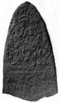 Runsten, Sö 357, rödaktig granit, 1,5 m h, 0,8 m br (ÖNÖ-VSV) och 0,15 m tj . Ristningen på den åt NNV vettade sidan. Runhöjd 10-12 cm. Den runristade ytan är nött och ornamentiken och inskriften okl...