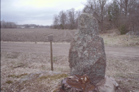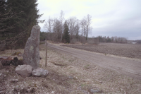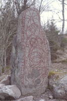 Runsten. SIGNUM U 1040. Grå granit 1,6 m h 0,65 m br (C 20cg N-V 20cg S) och0,65 m tj. Ristning mot N 20cg V. Runhöjd 0,06 m. Stenen lutar mot NNV. Se även Inventeringsbok. Stenen riktades, markföran...