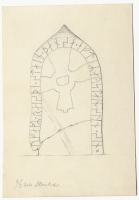 Runsten, grå granit, 1,8 m hög, 1,1 m bred (Ö-V) och 0,25 m tjock. Runhöjd, 12-14 cm. Ristningen vetter mot N. Enligt Östergötlands runinskrifter påträffades runstenen i grunden till kyrktornet vid om...