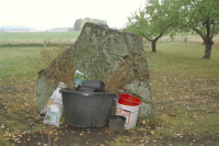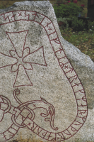 Runsten, gråvig granit, 1,6 m h, 1,8 m br (NV-SÖ) och intill 0,35 m tj. Runstensslingans bredd 0,03-0,1 m. I övre mittersta delenett likarmat kors med 0,2-0,25 m l korsarmar. Ristningsytan vetter mot ...