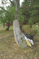 Runsten, gråvig granit, 1,6 m h, 1,8 m br (NV-SÖ) och intill 0,35 m tj. Runstensslingans bredd 0,03-0,1 m. I övre mittersta delenett likarmat kors med 0,2-0,25 m l korsarmar. Ristningsytan vetter mot S 44cg V. (SV). I övre NV delen är bortslagna bitar av stenen fastsatta med murbruk. Stenen lutar kraftigt åt SV. Rev inv 1979. Beskrivningen är inte kvalitetssäkrad. Information kan saknas, vara felaktig eller inaktuell. Se även Inventeringsbok.