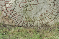 Runsten, granit, 1,6 m h och 0,8 m br vid basen, något avsmalnade uppåt, 0,25-0,4 m tj. Runslingans br 9-11 cm. Ristningen vetter mot Ö. "Ingefrid lät resa denna sten efter Öulv, sin fader och stav. Öulv gjorde detta ting i öster (?). Assur högg (runorna). Ginna utförde (tingsplats) i väster(?)". * hikifriþr * lit * r-isa * sain * þna * iftiR * ayulf * faþur * sin * auk * staf * ayulf- (k)iarþi ** þat * ausþiki * hiuk * asur * ifnti * kina * uistr Ingifríðr lét r[e]isa stein þenna eptir Eyjulf, fôður sinn, ok staf. Eyjulf[r] gerði þat austþingi(?). Hjó Ôzurr. Efndi(?) Ginna vestr. Ingifriðr let r[æ]isa stæin þenna æftiR Øyulf, faður sinn, ok staf. Øyulf[R] gærði þæt austþingi(?). Hiogg Assurr. Æfndi(?) Ginna vestr.
