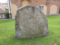 Runsten, av grå och ljus granit. SIGNUM: U 931. 1,22 m h, 1,38 m br (NÖ-SV) och 0,38 m tj. Ristningen vetter mot NV. Runhöjd 5-6 cm. Stenen imålades med rödfärg och flyttades till sin nuvarande plats Ö om Domkyrkan i juni 1976. Stenen torrengjordes, ångtvättades och etanolbehandlades två gånger 2021-2022. Se även Inventeringsbok.