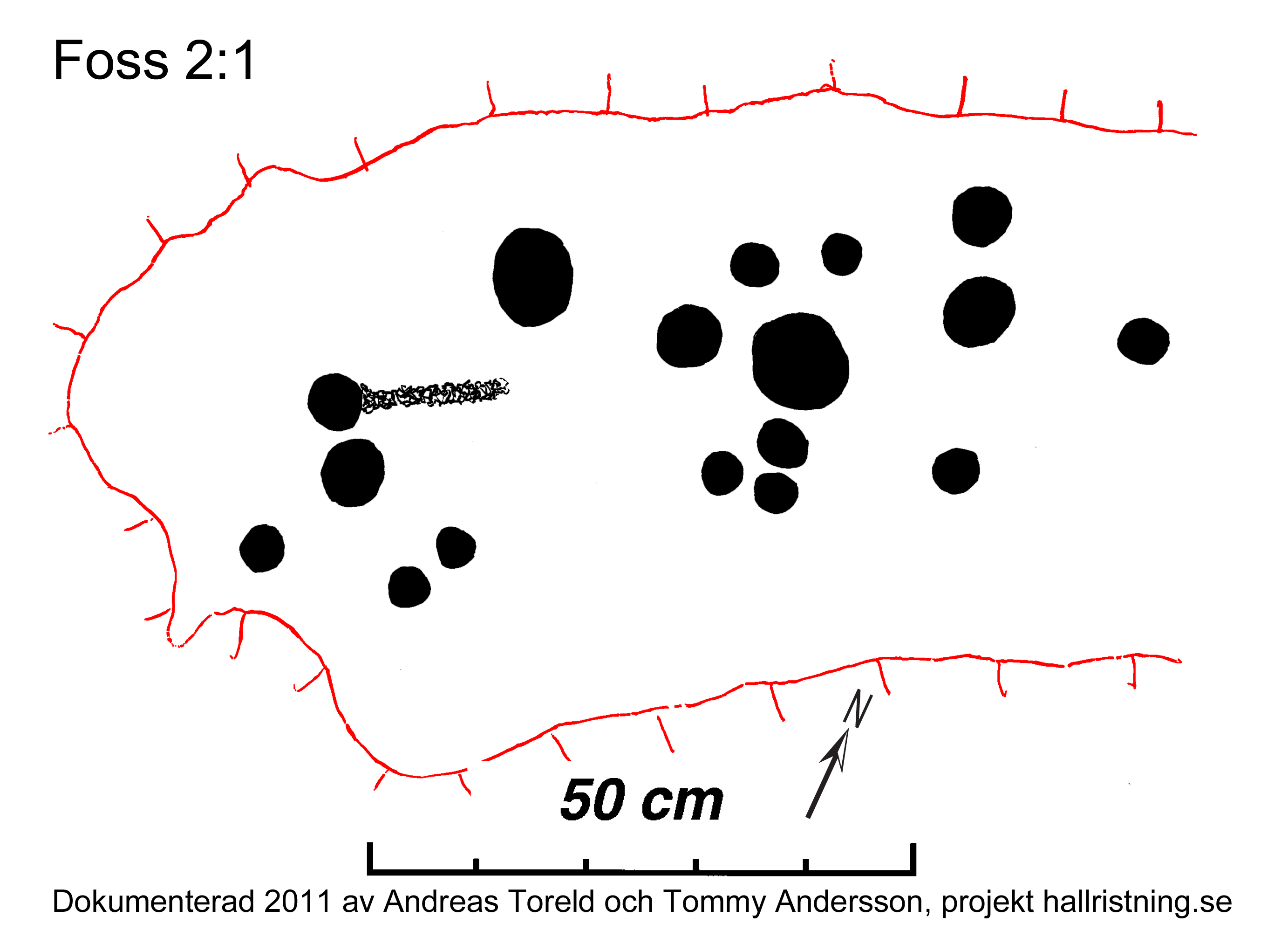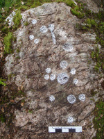 • Hällristning, 0,88x0,35 m (NÖ-SV), bestående av 17 skålgropar, 3,5-8 cm diam och 0,5-3 cm dj. Från en skålgrop utgår en ränna, 12 cm l. Belägen på den plana toppen av uppstickande bergrygg (3x1,5 m st... Visa hela